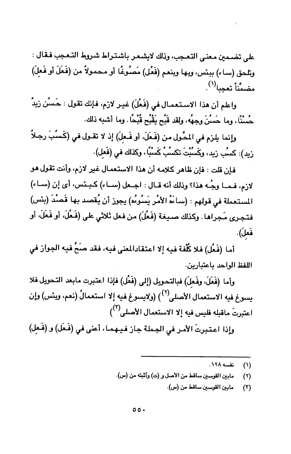 وأما (فَعَلَ، وفَعِلَ) فبالتحويل (إلى (فَعُل) فإذا اعتبرت ما بعد التحويل فلا يسوغ فيه الاستعمال الأصلي (2)) (ولا يسوغ فيه إلا استعمالُ (نعم، وبئس) وإن اعتبرتَ ما قبله فليس فيه إلا الاستعمال الأصلي (3)).
