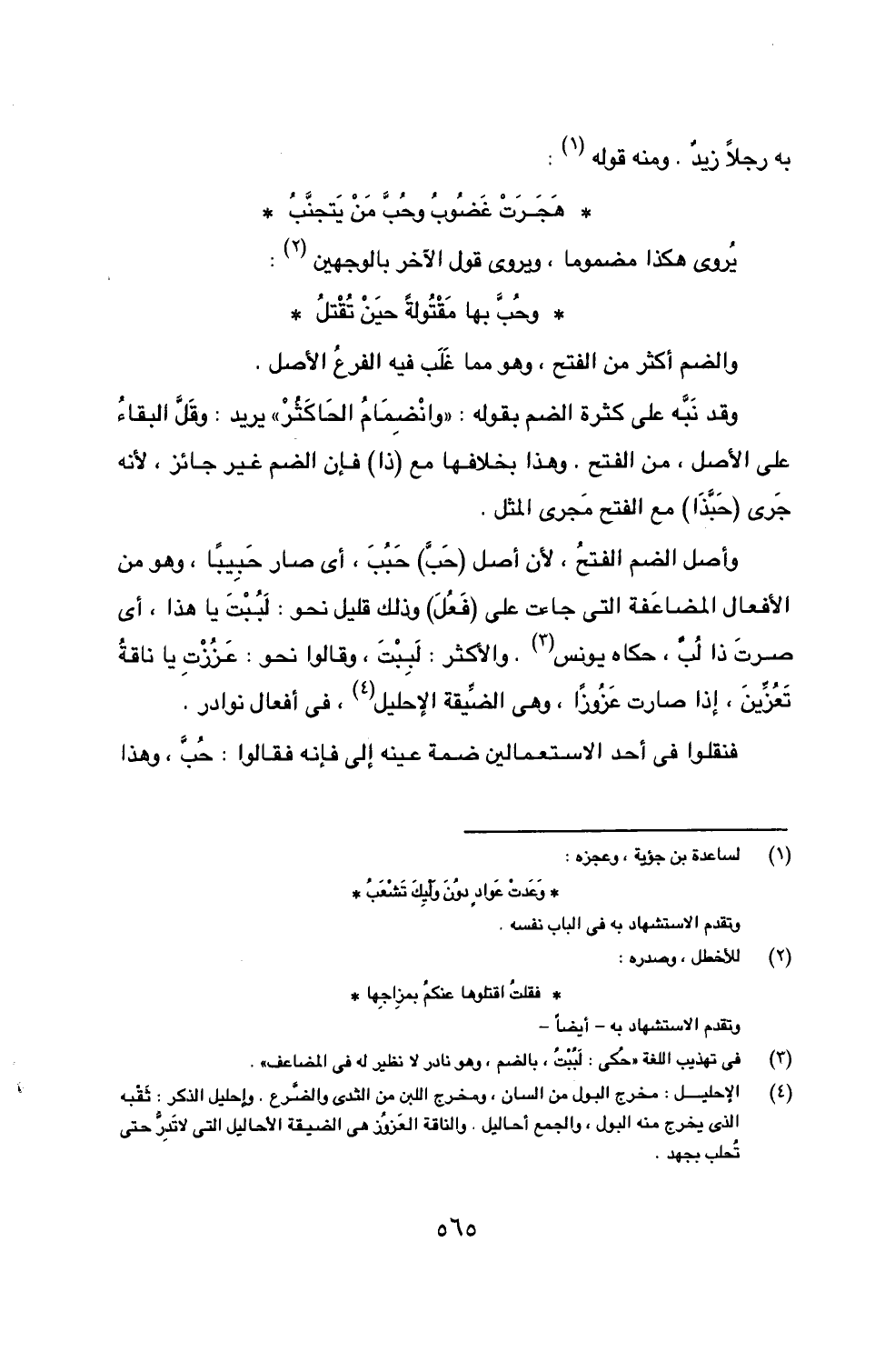 وأصل الضم الفتحُ، لأن أصل (حَبَّ) حَبُبَ، أي صار حَبِيباً، وهو من الأفعال المضاعَفة التي جاءت على (فَعُلَ) وذلك قليل نحو: لَبُبْتَ يا هذا، أي صرتَ ذا لُبّ، حكاه يونس (3). والأكثر: لَبِبْتَ، وقالوا نحو: عَزُزْتِ يا ناقةُ تَعُزِّينَ، إذا صارت عَزُوزاً، وهي الضيِّقة الإحليل (4)، في أفعال نوادر.