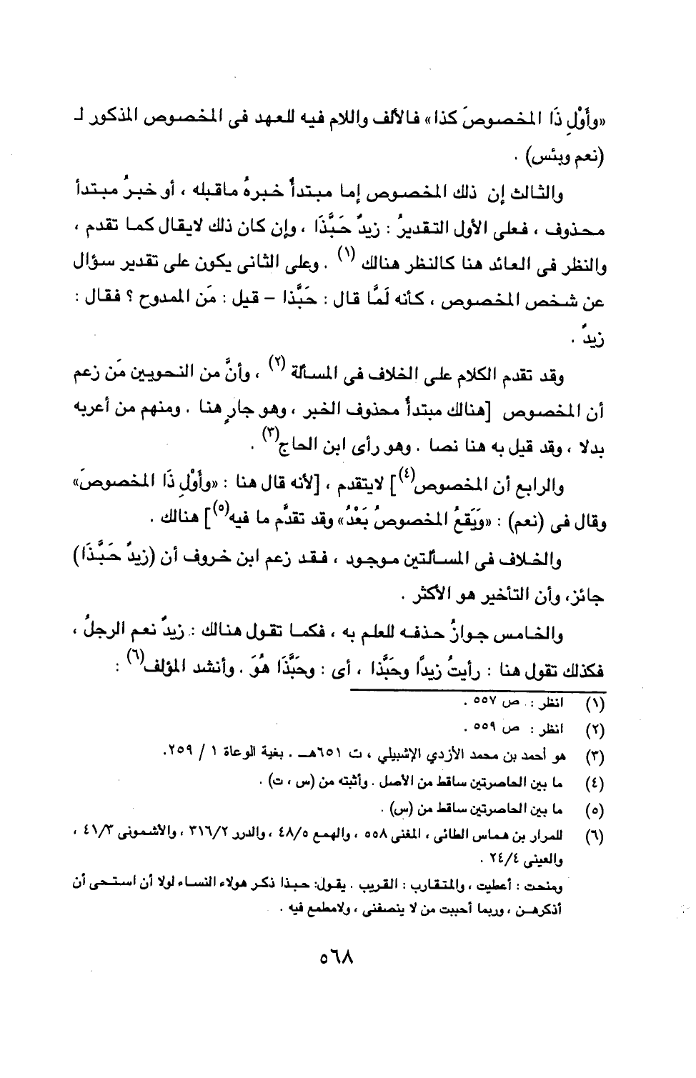والثالث إن ذلك المخصوص إما مبتدأٌ خبرهُ ما قبله، أو خبرُ مبتدأ محذوف، فعلى الأول التقديرُ: زيدٌ حَبَّذَا، وإن كان ذلك لا يقال كما تقدم، والنظر في العائد هنا كالنظر هنالك (1). وعلى الثاني يكون على تقدير سؤال عن شخص المخصوص، كأنه لَمَّا قال: حَبَّذَا- قيل: مَن الممدوح؟ فقال زيدٌ.