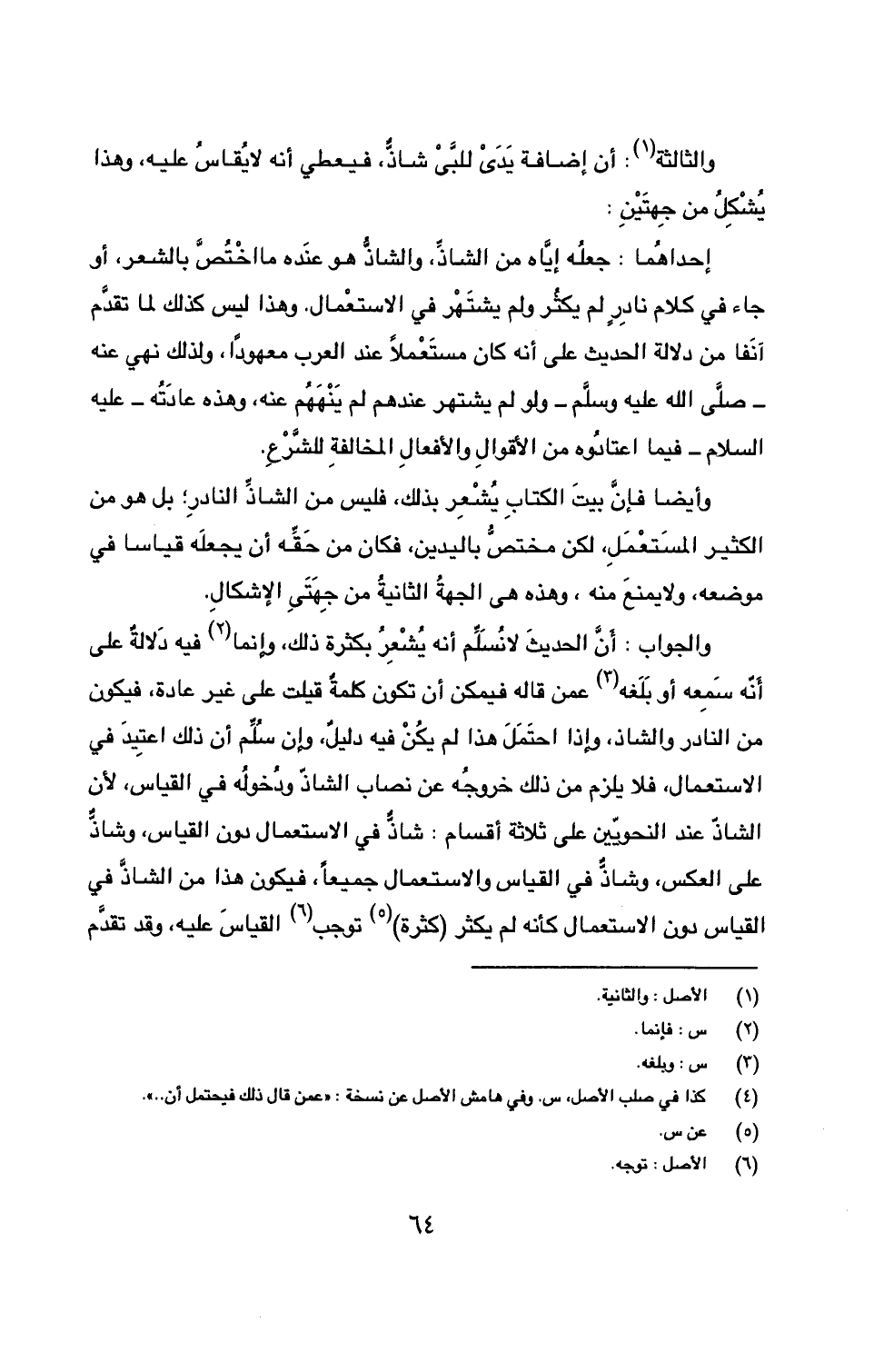 والجواب: أنَّ الحديث لا نُسَلِّم أنه يُشْعِرُ بكثرة ذلك، وإنما (2) فيه دلالةٌ على أنّه سَمِعه أو بَلَغه (3) عمن قاله فيمكن أن تكون كلمةٌ قيلت على غير عادة، فيكون من النادر والشاذ، وإذا احتَمَلَ هذا لم يكُنْ فيه دليلٌ، وإن سُلِّم أن ذلك اعتِيدَ في الاستعمال، فلا يلزم من ذلك خروجهُ عن نصاب الشاذّ ودُخولُه في القياس، لأن الشاذّ عند النحويين على ثلاثة اقسام: شاذٌّ في الاستعمال دون القياس، وشاذٌّ على العكس، وشاذٌّ في القياس والاستعمال جميعاً، فيكون هذا من الشاذَّ في القياس دون الاستعمال كأنه لم يكثر (كثرة) (5) توجب (6) القياس عليه، وقد تقدَّم
