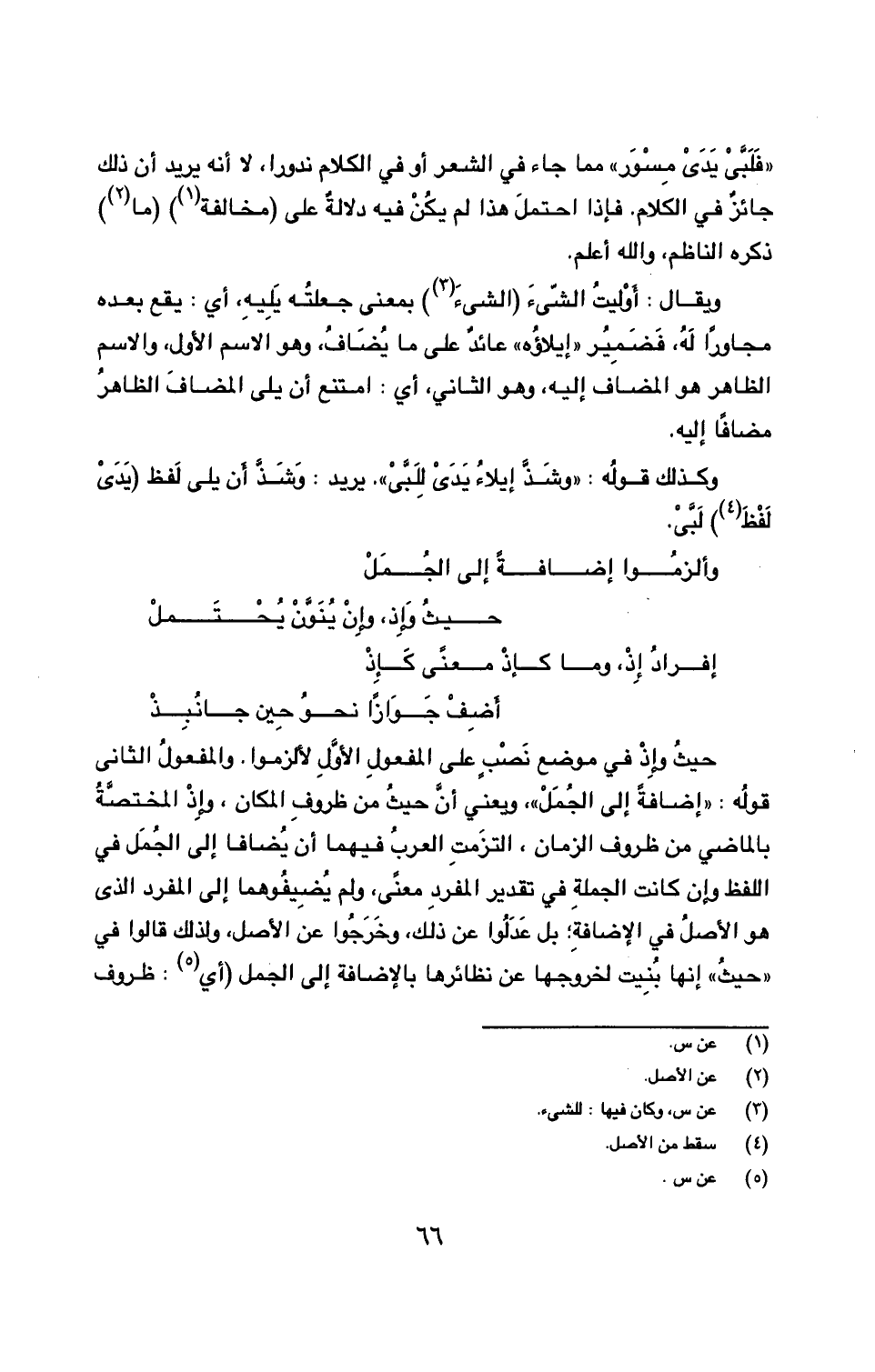 حيث وإِذْ في موضع نَصْبٍ على المفعولِ الأولِ لألزموا. والمفعولُ الثاني قوله: ((إضافةً إلى الجُمَلْ))، ويعني أن حيثُ من ظروفِ المكان، وإِذْ المختصَّةُ بالماضي من ظروف الزمان، التزَمتِ العربُ فيهما أن يُضافا إلى الجُمل في اللفظ وإن كانت الجملة في تقدير المفردِ معنى، ولم يُضيفُوهما إلى المفرد الذي هو الأصلُ في الإضافةِ؛ بل عَدَلُوا عن ذلك، وخَرَجُوا عن الأصل، ولذلك قالوا في ((حيثُ)) إنها بُنيت لخروجها عن نظائرها بالإضافة إلى الجمل (أي (5): ظروف