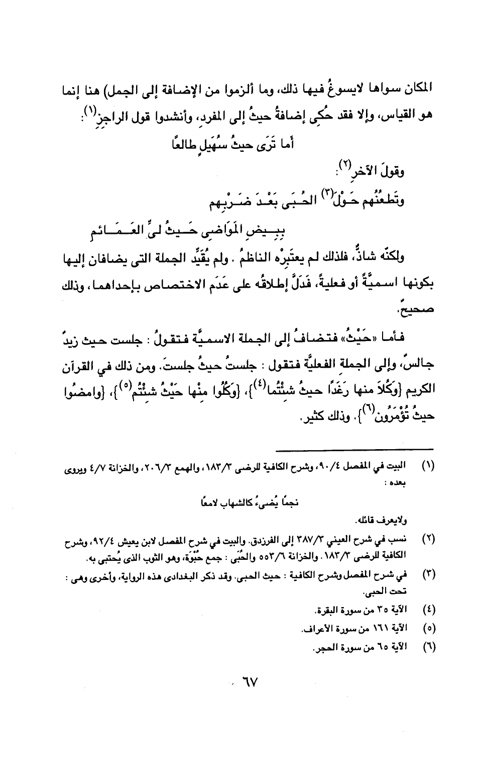 فأما ((حَيْثُ)) فتضافُ إلى الجملة الاسمية فتقول: جلست حيث زيدٌ جالسٌ، وإلى الجملةِ الفعليةِ فتقول: جلستُ حيثُ جلستَ. ومن ذلك في القرآن الكريم {وَكُلاَ منها رَغَداً حيثُ شِئْتُما (4)}، و {وَكُلُوا مِنْها حَيْثُ شِئْتُم (5)}، {وامضُوا حيثُ تُؤْمَرُون (6)}. وذلك كثير.