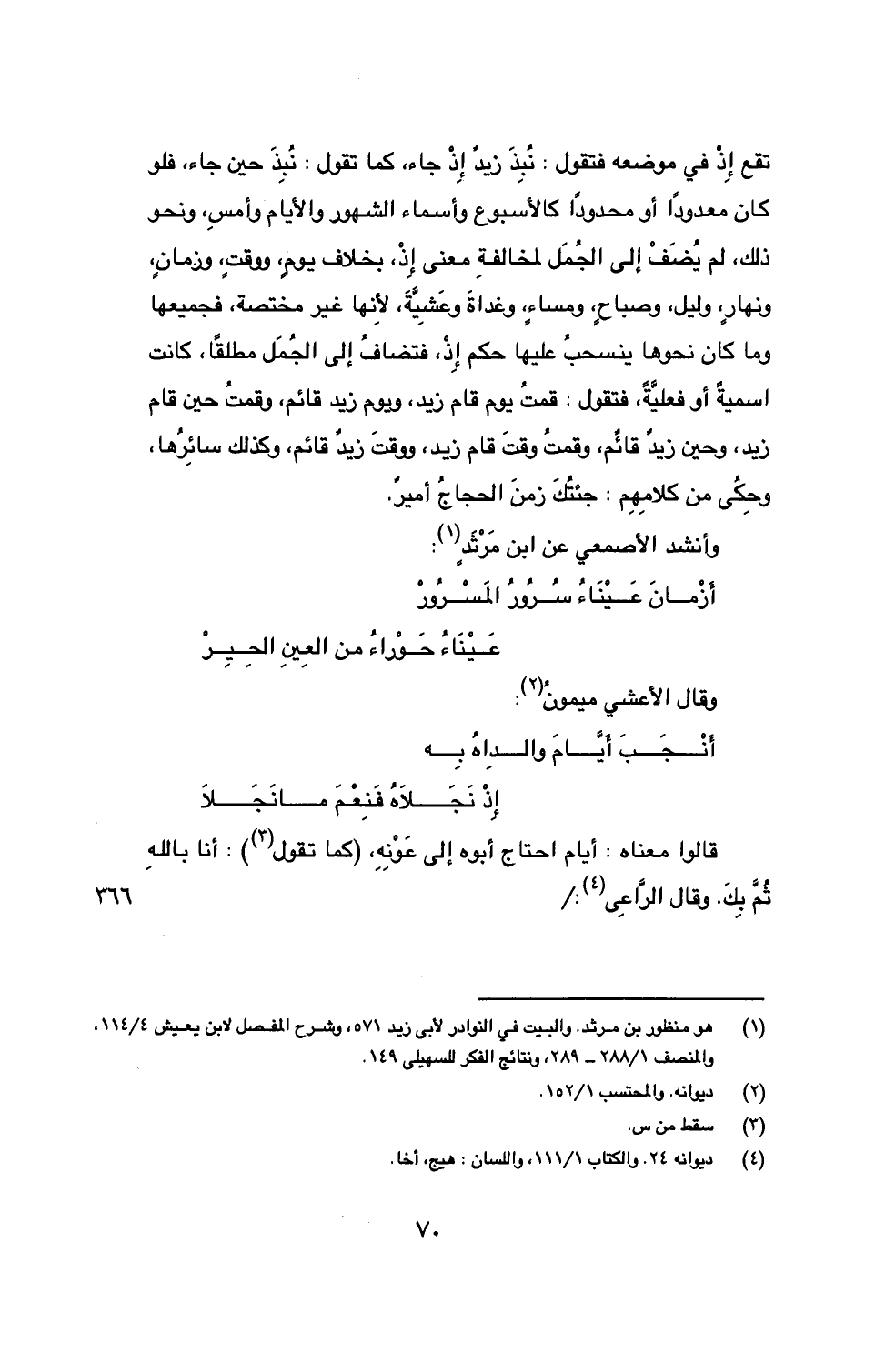 تقع إِذْ في موضعه فتقول: نُبِذَ زيدٌ إِذْ جاء، كما تقول: نُبِذَ حين جاء، فلو كان معدودا أو محدودا كالأسبوع وأسماء الشهور والأيام وأمس، ونحو ذلك، لم يُضَفْ إلى الجُمَل لمخالفةِ معنى إِذْ، بخلاف يومٍ، ووقتٍ، وزمانٍ، ونهارٍ، وليلٍ، وصباحٍ، ومساءٍ، وغداةَ وعَشِيَّةَ، لأنها غير مختصة، فجميعها وما كان نحوها ينسحبُ عليها حكم إِذْ، فتضاف إلى الجُمَل مطلقاً، كانت اسميةً أو فعليَّةً، فتقول: قمنُ يوم قام زيد، ويوم زيد قائم، وقمتُ حين قام زيد، وحين زيدٌ قائمٌ، وقمتُ وقتَ قام زيد، ووقتَ زيدٌ قائم، وكذلك سائرها، وحِكُى من كلامهم: جئتُكَ زمنَ الحجاجُ أميرٌ.