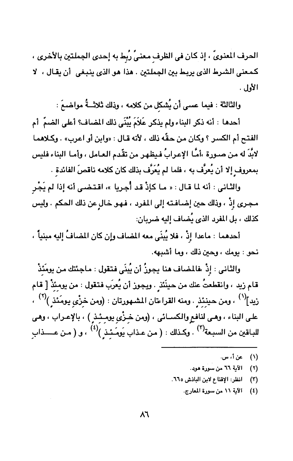 والثاني: إِذْ، فالمضاف هنا يجوزُ أن يُبنَى فتقول: ما جئتك من يومَئِذْ قام زيد، وانقطعتُ عنك من حينئذِ. ويجوز أن يُعرَب فتقول: من يومِئِذْ [قام زيد] (1)، ومن حينئِذٍ. ومنه القراءتان المشهورتان: (ومن خِزْيِ يومَئذٍ) (2)، على البناء، وهي لنافع والكسائي، (ومن خِزْيِ يومِئِذٍ)، بالإعراب، وهي للباقين من السبعة (3). وكذلك: (من عذاب يَومَئِذٍ) (4)، و (من عذابِ