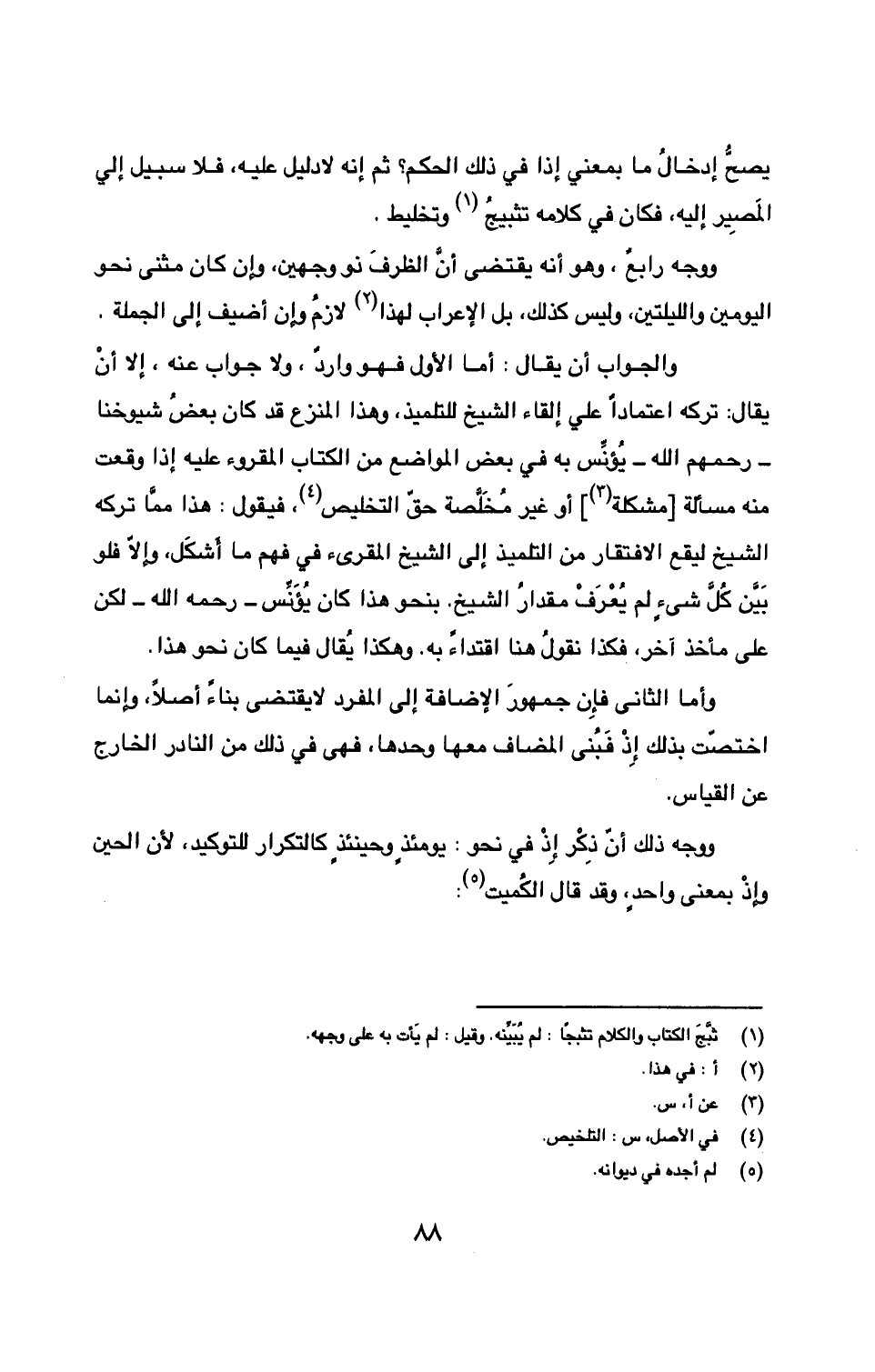 ووجه رابعٌ، وهو أنه يقتضي أن الظرف ذو وجهين، وإن كان مثنى نحو اليومين والليلتين، وليس كذلك، بل الإعراب لهذا (2) لازمُ وإن أضيف إلى الجملة. والجواب أن يقال: أما الأول فهو واردٌ، ولا جواب عنه، إلا أنْ يقال: تركه اعتماداً على إلقاء الشيخ للتلميذ، وهذا المنزع قد كان بعضُ شيوخنا - رحمهم الله- يُؤنِّس به في بعض المواضع من الكتاب المقروء عليه إذا وقعت منه مسألة [مشكلة (3)] أو غير مُخَلَّصة حقّ التخليص (4)، فيقول: هذا مما تركه الشيخ ليقع الافتقار من التلميذ إلى الشيخ المقرئ في فهم ما أَشكَل، وإلا فلو بَيَّن كُلَّ شيءٍ لم يُعْرَفْ مقدارُ الشيخ، بنحو هذا كان يُؤَنِّس- رحمه الله- لكن على مأخذ آخر، فكذا نقولُ هنا اقتداءً به. وهكذا يُقال فيما كان نحو هذا.