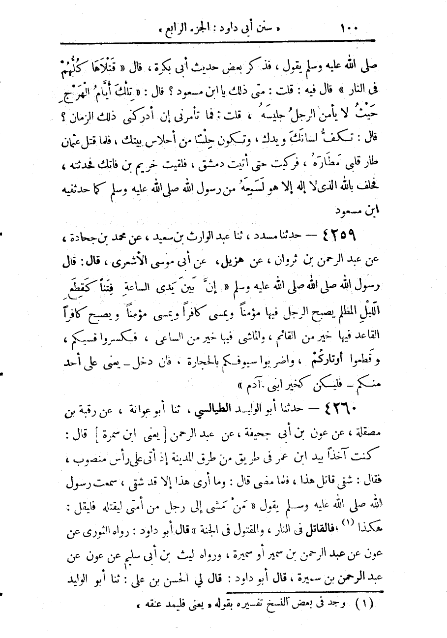 4260 - حَدَّثَنَا أَبُو الْوَلِيدِ الطَّيَالِسِيُّ، حَدَّثَنَا أَبُو عَوَانَةَ، عَنْ رَقَبَةَ بْنِ مَصْقَلَةَ، عَنْ عَوْنِ بْنِ أَبِي جُحَيْفَةَ، عَنْ عَبْدِ الرَّحْمَنِ يَعْنِي ابْنَ سَمُرَةَ، قَالَ: كُنْتُ آخِذًا بِيَدِ ابْنِ عُمَرَ فِي طَرِيقٍ مِنْ طُرُقِ الْمَدِينَةِ، إِذْ أَتَى عَلَى رَأْسٍ مَنْصُوبٍ، فَقَالَ: شَقِيَ قَاتِلُ هَذَا، فَلَمَّا مَضَى، قَالَ: وَمَا أُرَى هَذَا إِلَّا قَدْ شَقِيَ، سَمِعْتُ رَسُولَ اللَّهِ صَلَّى اللهُ عَلَيْهِ وَسَلَّمَ يَقُولُ: " §مَنْ مَشَى إِلَى رَجُلٍ مِنْ أُمَّتِي لِيَقْتُلَهُ، فَلْيَقُلْ: هَكَذَا، فَالْقَاتِلُ فِي النَّارِ، وَالْمَقْتُولُ فِي الْجَنَّةِ " قَالَ أَبُو دَاوُدَ: رَوَاهُ الثَّوْرِيُّ، عَنْ عَوْنٍ، عَنْ عَبْدِ الرَّحْمَنِ بْنِ سُمَيْرٍ أَوْ سُمَيْرَةَ، وَرَوَاهُ لَيْثُ بْنُ أَبِي سُلَيْمٍ، عَنْ عَوْنٍ، عَنْ عَبْدِ الرَّحْمَنِ بْنِ سُمَيْرَةَ. قَالَ أَبُو دَاوُدَ: قَالَ لِي الْحَسَنُ بْنُ عَلِيٍّ، حَدَّثَنَا أَبُو الْوَلِيدِ -[101]- بِهَذَا الْحَدِيثِ، عَنْ أَبِي عَوَانَةَ، وَقَالَ: هُوَ فِي كِتَابِي ابْنُ سَبَرَةَ، وَقَالُوا: سَمُرَةَ، وَقَالُوا: سُمَيْرَةَ، هَذَا كَلَامُ أَبِي الْوَلِيدِ