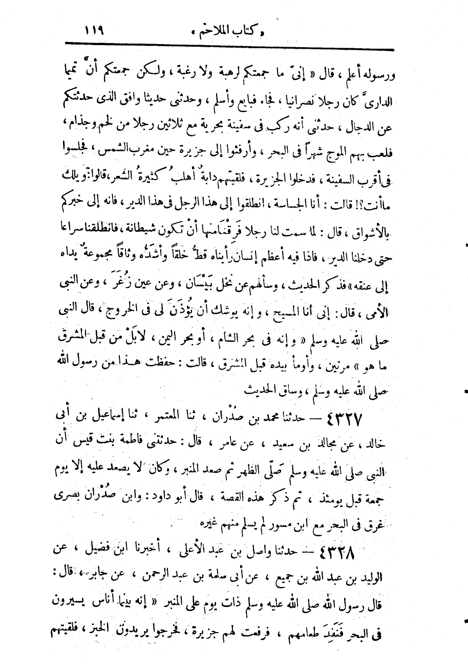 4328 - حَدَّثَنَا وَاصِلُ بْنُ عَبْدِ الْأَعْلَى، أَخْبَرَنَا ابْنُ فُضَيْلٍ، عَنِ الْوَلِيدِ بْنِ عَبْدِ اللَّهِ بْنِ جُمَيْعٍ، عَنْ أَبِي سَلَمَةَ بْنِ عَبْدِ الرَّحْمَنِ، عَنْ جَابِرٍ، قَالَ: قَالَ رَسُولُ اللَّهِ صَلَّى اللهُ عَلَيْهِ وَسَلَّمَ ذَاتَ يَوْمٍ عَلَى الْمِنْبَرِ: «إِنَّهُ بَيْنَمَا أُنَاسٌ يَسِيرُونَ فِي الْبَحْرِ، فَنَفِدَ طَعَامُهُمْ، فَرُفِعَتْ لَهُمْ جَزِيرَةٌ، فَخَرَجُوا يُرِيدُونَ الْخُبْزَ، فَلَقِيَتْهُمُ -[120]- الْجَسَّاسَةُ» قُلْتُ لِأَبِي سَلَمَةَ: وَمَا الْجَسَّاسَةُ؟ قَالَ: امْرَأَةٌ تَجُرُّ شَعْرَ جِلْدِهَا وَرَأْسِهَا، قَالَتْ: فِي هَذَا الْقَصْرِ، فَذَكَرَ الْحَدِيثَ، وَسَأَلَ عَنْ نَخْلِ بَيْسَانَ، وَعَنْ عَيْنِ زُغَرَ، قَالَ: هُوَ الْمَسِيحُ، فَقَالَ: لِي ابْنُ أَبِي سَلَمَةَ: إِنَّ فِي هَذَا الْحَدِيثِ شَيْئًا مَا حَفِظْتُهُ، قَالَ: شَهِدَ جَابِرٌ أَنَّهُ هُوَ ابْنُ صَيَّادٍ، قُلْتُ: فَإِنَّهُ قَدْ مَاتَ، قَالَ: وَإِنْ مَاتَ، قُلْتُ: فَإِنَّهُ أَسْلَمَ، قَالَ: وَإِنْ أَسْلَمَ، قُلْتُ فَإِنَّهُ قَدْ دَخَلَ الْمَدِينَةَ، قَالَ: وَإِنْ دَخَلَ الْمَدِينَةَ