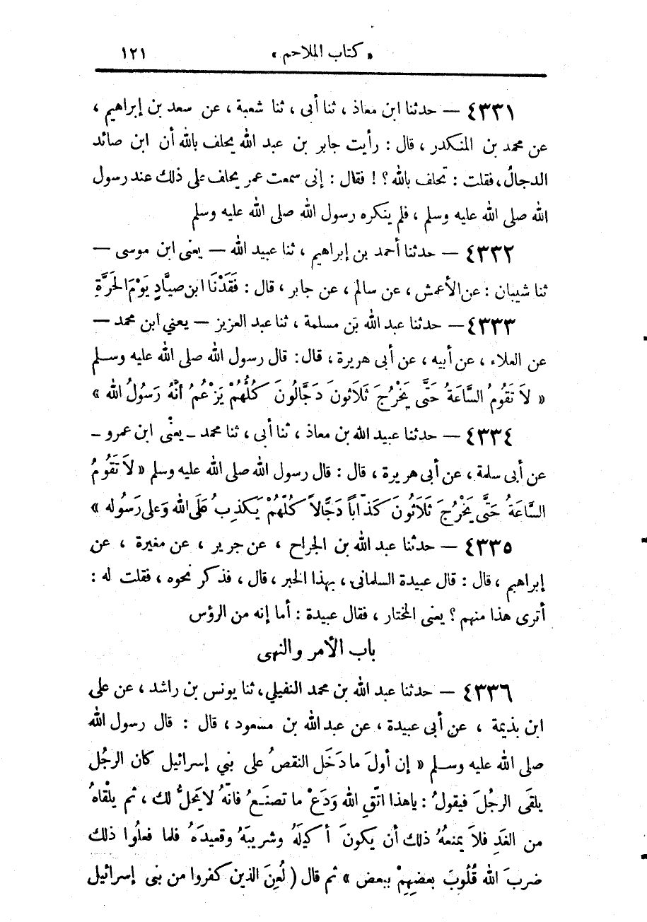 4331 - حَدَّثَنَا ابْنُ مُعَاذٍ، حَدَّثَنَا أَبِي، حَدَّثَنَا شُعْبَةُ، عَنْ سَعْدِ بْنِ إِبْرَاهِيمَ، عَنْ مُحَمَّدِ بْنِ الْمُنْكَدِرِ، قَالَ: رَأَيْتُ جَابِرَ بْنَ عَبْدِ اللَّهِ §يَحْلِفُ بِاللَّهِ أَنَّ ابْنَ صَائِدٍ الدَّجَّالُ، فَقُلْتُ: تَحْلِفُ بِاللَّهِ، فَقَالَ: إِنِّي سَمِعْتُ عُمَرَ يَحْلِفُ عَلَى ذَلِكَ عِنْدَ رَسُولِ اللَّهِ صَلَّى اللهُ عَلَيْهِ وَسَلَّمَ، فَلَمْ يُنْكِرْهُ رَسُولُ اللَّهِ صَلَّى اللهُ عَلَيْهِ وَسَلَّمَ "