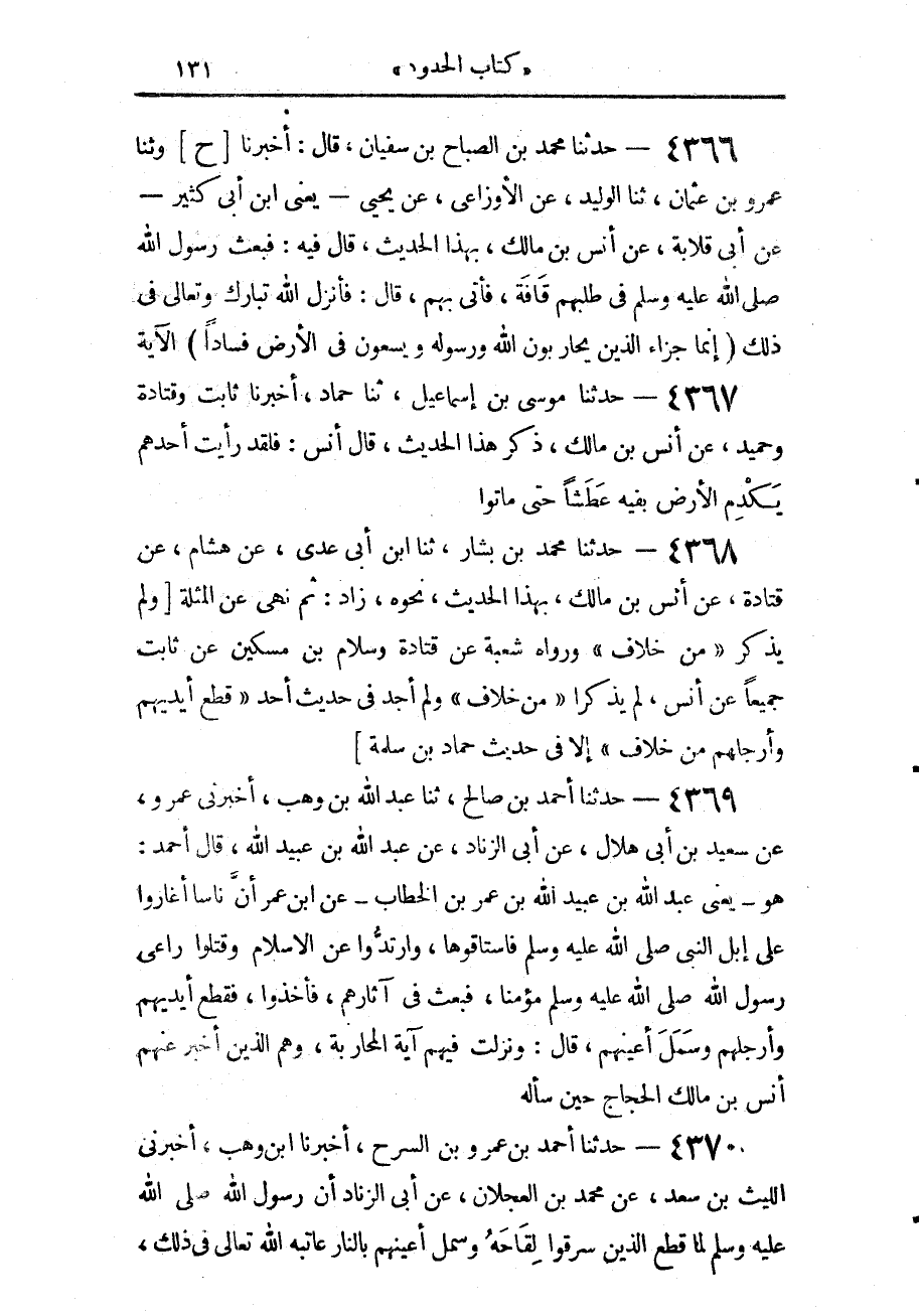 4369 - حَدَّثَنَا أَحْمَدُ بْنُ صَالِحٍ، حَدَّثَنَا عَبْدُ اللَّهِ بْنُ وَهْبٍ، أَخْبَرَنِي عَمْرٌو، عَنْ سَعِيدِ بْنِ أَبِي هِلَالٍ، عَنْ أَبِي الزِّنَادِ، عَنْ عَبِدِ اللَّهِ بْنِ عُبَيْدِ اللَّهِ - قَالَ أَحْمَدُ: هُوَ يَعْنِي عَبْدَ اللَّهِ بْنَ عُبَيْدِ اللَّهِ بْنِ عُمَرَ بْنِ الْخَطَّابِ - عَنِ ابْنِ عُمَرَ، «أَنَّ نَاسًا أَغَارُوا عَلَى إِبِلِ النَّبِيِّ صَلَّى اللهُ عَلَيْهِ وَسَلَّمَ، فَاسْتَاقُوهَا، وَارْتَدُّوا عَنِ الْإِسْلَامِ، وَقَتَلُوا رَاعِيَ رَسُولِ اللَّهِ صَلَّى اللهُ عَلَيْهِ وَسَلَّمَ مُؤْمِنًا، فَبَعَثَ فِي آثَارِهِمْ، فَأُخِذُوا،» §فَقَطَّعَ أَيْدِيَهُمْ وَأَرْجُلَهُمْ، وَسَمَلَ أَعْيُنَهُمْ "، قَالَ: وَنَزَلَتْ فِيهِمْ آيَةُ الْمُحَارَبَةِ، وَهُمُ الَّذِينَ أَخْبَرَ عَنْهُمْ أَنَسُ بْنُ مَالِكٍ الْحَجَّاجَ حِينَ سَأَلَهُ