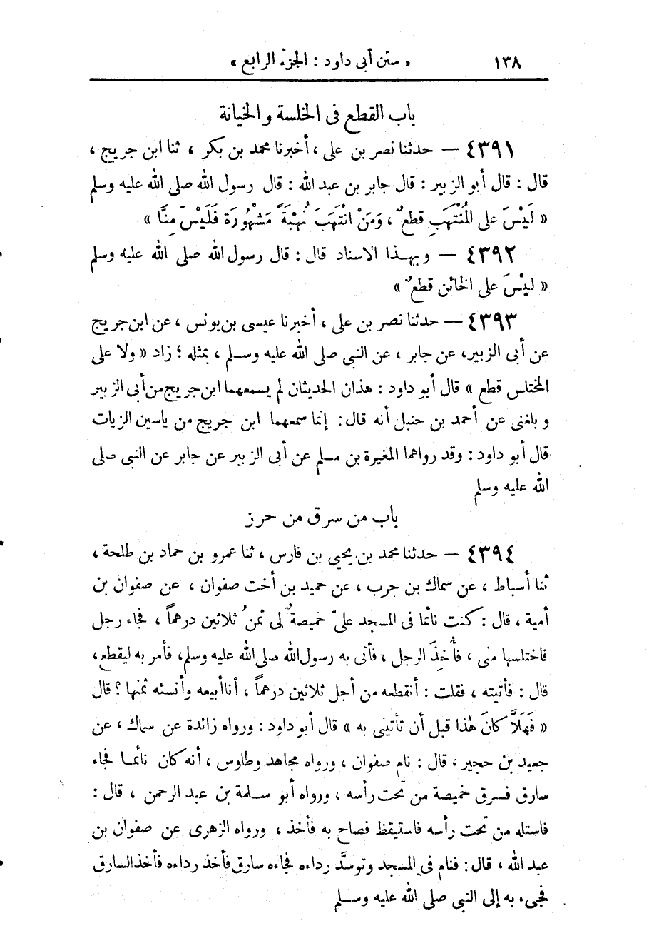 4394 - حَدَّثَنَا مُحَمَّدُ بْنُ يَحْيَى بْنِ فَارِسٍ، حَدَّثَنَا عَمْرُو بْنُ حَمَّادِ بْنِ طَلْحَةَ، حَدَّثَنَا أَسْبَاطٌ، عَنْ سِمَاكِ بْنِ حَرْبٍ، عَنْ حُمَيْدِ ابْنِ أُخْتِ صَفْوَانَ، عَنْ صَفْوَانَ بْنِ أُمَيَّةَ، قَالَ: كُنْتُ نَائِمًا فِي الْمَسْجِدِ عَلَيَّ خَمِيصَةٌ لِي ثَمَنُ ثَلَاثِينَ دِرْهَمًا، فَجَاءَ رَجُلٌ فَاخْتَلَسَهَا مِنِّي، فَأُخِذَ الرَّجُلُ، فَأُتِيَ بِهِ رَسُولُ اللَّهِ صَلَّى اللهُ عَلَيْهِ وَسَلَّمَ، §فَأَمَرَ بِهِ لِيُقْطَعَ، قَالَ: فَأَتَيْتُهُ، فَقُلْتُ: أَتَقْطَعُهُ مِنْ أَجْلِ ثَلَاثِينَ دِرْهَمًا، أَنَا أَبِيعُهُ وَأُنْسِئُهُ ثَمَنَهَا؟ قَالَ: «فَهَلَّا كَانَ هَذَا قَبْلَ أَنْ تَأْتِيَنِي بِهِ» قَالَ أَبُو دَاوُدَ: وَرَوَاهُ زَائِدَةُ، عَنْ سِمَاكٍ، عَنْ جُعَيْدِ بْنِ حُجَيْرٍ، قَالَ: نَامَ صَفْوَانُ، وَرَوَاهُ مُجَاهِدٌ، وَطَاوُسٌ، أَنَّهُ كَانَ نَائِمًا فَجَاءَ سَارِقٌ فَسَرَقَ خَمِيصَةً مِنْ تَحْتِ رَأْسِهِ، وَرَوَاهُ أَبُو سَلَمَةَ بْنُ عَبْدِ الرَّحْمَنِ، قَالَ: فَاسْتَلَّهُ مِنْ تَحْتِ رَأْسِهِ فَاسْتَيْقَظَ، فَصَاحَ بِهِ فَأُخِذَ. وَرَوَاهُ الزُّهْرِيُّ، عَنْ صَفْوَانَ بْنِ عَبْدِ اللَّهِ قَالَ: فَنَامَ فِي الْمَسْجِدِ، وَتَوَسَّدَ رِدَاءَهُ، فَجَاءَ سَارِقٌ فَأَخَذَ رِدَاءَهُ، فَأُخِذَ السَّارِقُ فَجِيءَ بِهِ إِلَى النَّبِيِّ صَلَّى اللهُ عَلَيْهِ وَسَلَّمَ
