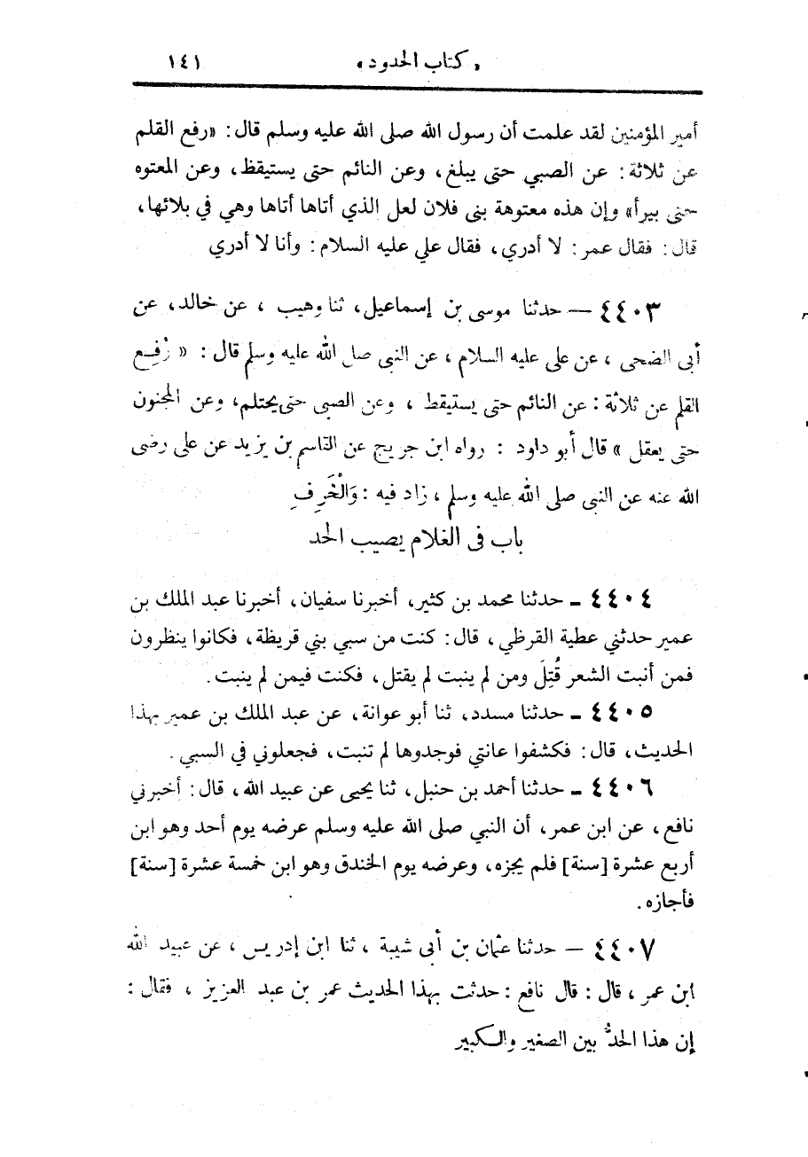 4407 - حَدَّثَنَا عُثْمَانُ بْنُ أَبِي شَيْبَةَ، حَدَّثَنَا ابْنُ إِدْرِيسَ، عَنْ عُبَيْدِ اللَّهِ بْنِ عُمَرَ، قَالَ: قَالَ نَافِعٌ، حَدَّثْتُ بِهَذَا الْحَدِيثِ عُمَرَ بْنَ عَبْدِ الْعَزِيزِ، فَقَالَ: إِنَّ هَذَا الْحَدُّ بَيْنَ الصَّغِيرِ وَالْكَبِيرِ