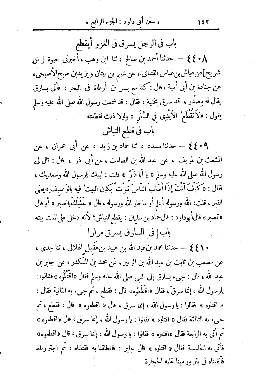 4410 - حَدَّثَنَا مُحَمَّدُ بْنُ عَبْدِ اللَّهِ بْنِ عُبَيْدِ بْنِ عَقِيلٍ الْهِلَالِيُّ، حَدَّثَنَا جَدِّي، عَنْ مُصْعَبِ بْنِ ثَابِتِ بْنِ عَبْدِ اللَّهِ بْنِ الزُّبَيْرِ، عَنْ مُحَمَّدِ بْنِ الْمُنْكَدِرِ، عَنْ جَابِرِ بْنِ عَبْدِ اللَّهِ، قَالَ: جِيءَ بِسَارِقٍ إِلَى النَّبِيِّ صَلَّى اللهُ عَلَيْهِ وَسَلَّمَ فَقَالَ: «§اقْتُلُوهُ»، فَقَالُوا: يَا رَسُولَ اللَّهِ، إِنَّمَا سَرَقَ، فَقَالَ: «اقْطَعُوهُ»، قَالَ: فَقُطِعَ، ثُمَّ جِيءَ بِهِ الثَّانِيَةَ، فَقَالَ: «اقْتُلُوهُ»، فَقَالُوا: يَا رَسُولَ اللَّهِ، إِنَّمَا سَرَقَ، فَقَالَ «اقْطَعُوهُ»، قَالَ: فَقُطِعَ، ثُمَّ جِيءَ بِهِ الثَّالِثَةَ، فَقَالَ: «اقْتُلُوهُ»، فَقَالُوا: يَا رَسُولَ اللَّهِ، إِنَّمَا سَرَقَ، فَقَالَ: «اقْطَعُوهُ»، ثُمَّ أُتِيَ بِهِ الرَّابِعَةَ، فَقَالَ: «اقْتُلُوهُ»، فَقَالُوا: يَا رَسُولَ اللَّهِ: إِنَّمَا سَرَقَ، قَالَ: «اقْطَعُوهُ»، فَأُتِيَ بِهِ الْخَامِسَةَ، فَقَالَ «اقْتُلُوهُ»، قَالَ جَابِرٌ: فَانْطَلَقْنَا بِهِ فَقَتَلْنَاهُ، ثُمَّ اجْتَرَرْنَاهُ فَأَلْقَيْنَاهُ فِي بِئْرٍ، وَرَمَيْنَا عَلَيْهِ الْحِجَارَةَ