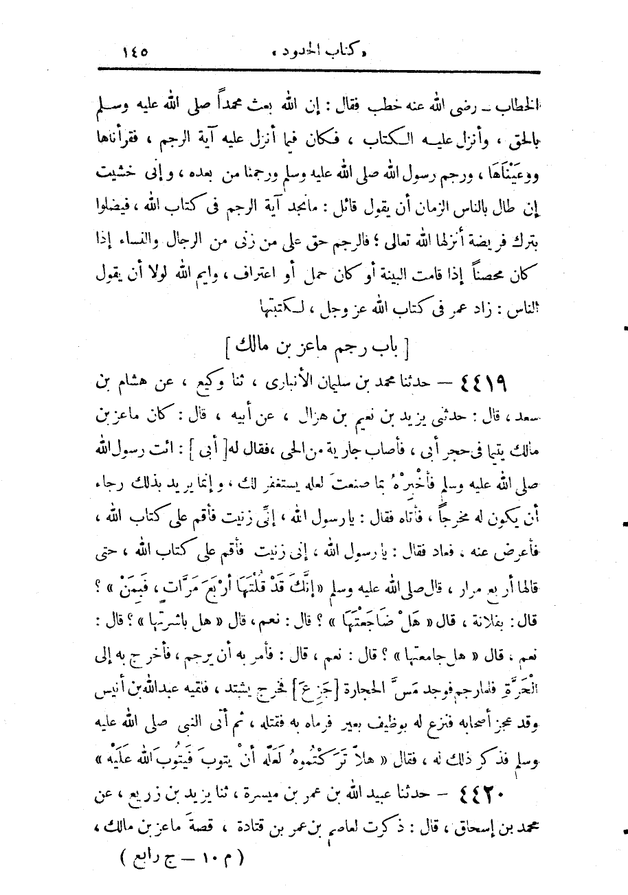 4419 - حَدَّثَنَا مُحَمَّدُ بْنُ سُلَيْمَانَ الْأَنْبَارِيُّ، حَدَّثَنَا وَكِيعٌ، عَنْ هِشَامِ بْنِ سَعْدٍ، قَالَ: حَدَّثَنِي يَزِيدُ بْنُ نُعَيْمِ بْنِ هَزَّالٍ، عَنْ أَبِيهِ، قَالَ: كَانَ مَاعِزُ بْنُ مَالِكٍ يَتِيمًا فِي حِجْرِ أَبِي، فَأَصَابَ جَارِيَةً مِنَ الْحَيِّ، فَقَالَ لَهُ أَبِي: ائْتِ رَسُولَ اللَّهِ صَلَّى اللهُ عَلَيْهِ وَسَلَّمَ، فَأَخْبِرْهُ بِمَا صَنَعْتَ لَعَلَّهُ يَسْتَغْفِرُ لَكَ، وَإِنَّمَا يُرِيدُ بِذَلِكَ رَجَاءَ أَنْ يَكُونَ لَهُ مَخْرَجًا، فَأَتَاهُ، فَقَالَ: يَا رَسُولَ اللَّهِ، إِنِّي زَنَيْتُ فَأَقِمْ عَلَيَّ كِتَابَ اللَّهِ، فَأَعْرَضَ عَنْهُ، فَعَادَ، فَقَالَ: يَا رَسُولَ اللَّهِ، إِنِّي زَنَيْتُ فَأَقِمْ عَلَيَّ كِتَابَ اللَّهِ، فَأَعْرَضَ عَنْهُ فَعَادَ، فَقَالَ: يَا رَسُولَ اللَّهِ، إِنِّي زَنَيْتُ، فَأَقِمْ عَلَيَّ كِتَابَ اللَّهِ، حَتَّى قَالَهَا أَرْبَعَ مِرَارٍ، قَالَ صَلَّى اللهُ عَلَيْهِ وَسَلَّمَ: «إِنَّكَ قَدْ قُلْتَهَا أَرْبَعَ مَرَّاتٍ، فَبِمَنْ؟» قَالَ: بِفُلَانَةٍ، فَقَالَ: «هَلْ ضَاجَعْتَهَا؟» قَالَ: نَعَمْ، قَالَ: «هَلْ بَاشَرْتَهَا؟» قَالَ: نَعَمْ، قَالَ: «هَلْ جَامَعْتَهَا؟» قَالَ: نَعَمْ، قَالَ: فَأَمَرَ بِهِ أَنْ يُرْجَمَ، فَأُخْرِجَ بِهِ إِلَى الْحَرَّةِ، فَلَمَّا رُجِمَ فَوَجَدَ مَسَّ الْحِجَارَةِ جَزِعَ فَخَرَجَ يَشْتَدُّ، فَلَقِيَهُ عَبْدُ اللَّهِ بْنُ أُنَيْسٍ وَقَدْ عَجَزَ أَصْحَابُهُ، فَنَزَعَ لَهُ بِوَظِيفِ بَعِيرٍ فَرَمَاهُ بِهِ فَقَتَلَهُ،، ثُمَّ أَتَى النَّبِيَّ صَلَّى اللهُ عَلَيْهِ وَسَلَّمَ فَذَكَرَ ذَلِكَ لَهُ، فَقَالَ: «§هَلَّا تَرَكْتُمُوهُ لَعَلَّهُ أَنْ يَتُوبَ، فَيَتُوبَ اللَّهُ عَلَيْهِ»