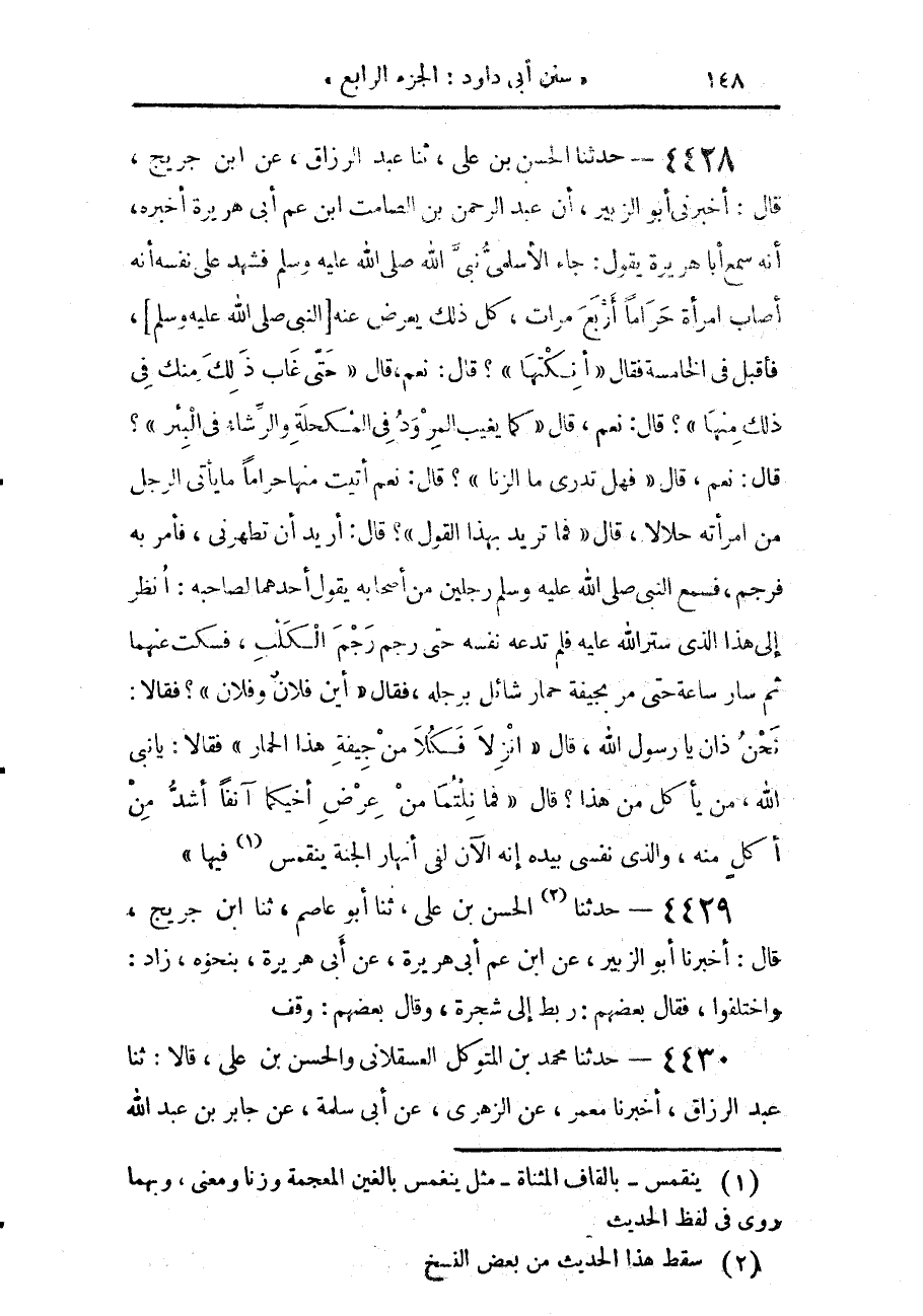 4428 - حَدَّثَنَا الْحَسَنُ بْنُ عَلِيٍّ، حَدَّثَنَا عَبْدُ الرَّزَّاقِ، عَنِ ابْنِ جُرَيْجٍ، قَالَ: أَخْبَرَنِي أَبُو الزُّبَيْرِ، أَنَّ عَبْدَ الرَّحْمَنِ بْنَ الصَّامِتِ، ابْنَ عَمِّ أَبِي هُرَيْرَةَ، أَخْبَرَهُ، أَنَّهُ سَمِعَ أَبَا هُرَيْرَةَ، يَقُولُ: جَاءَ الْأَسْلَمِيُّ نَبِيَّ اللَّهِ صَلَّى اللهُ عَلَيْهِ وَسَلَّمَ، فَشَهِدَ عَلَى نَفْسِهِ أَنَّهُ أَصَابَ امْرَأَةً حَرَامًا أَرْبَعَ مَرَّاتٍ، كُلُّ ذَلِكَ يُعْرِضُ عَنْهُ النَّبِيُّ صَلَّى اللهُ عَلَيْهِ وَسَلَّمَ، فَأَقْبَلَ فِي الْخَامِسَةِ، فَقَالَ: «أَنِكْتَهَا؟» قَالَ: نَعَمْ، قَالَ: «حَتَّى غَابَ ذَلِكَ مِنْكَ فِي ذَلِكَ مِنْهَا؟» قَالَ: نَعَمْ، قَالَ: «كَمَا يَغِيبُ الْمِرْوَدُ فِي الْمُكْحُلَةِ، وَالرِّشَاءُ فِي الْبِئْرِ؟» قَالَ: نَعَمْ، قَالَ: «فَهَلْ تَدْرِي مَا الزِّنَا؟» قَالَ: نَعَمْ، أَتَيْتُ مِنْهَا حَرَامًا مَا يَأْتِي الرَّجُلُ مِنَ امْرَأَتِهِ حَلَالًا، قَالَ: «فَمَا تُرِيدُ بِهَذَا الْقَوْلِ؟» قَالَ: أُرِيدُ أَنْ تُطَهِّرَنِي، فَأَمَرَ بِهِ فَرُجِمَ، فَسَمِعَ النَّبِيُّ صَلَّى اللهُ عَلَيْهِ وَسَلَّمَ رَجُلَيْنِ مِنْ أَصْحَابِهِ يَقُولُ أَحَدُهُمَا لِصَاحِبِهِ: انْظُرْ إِلَى هَذَا الَّذِي سَتَرَ اللَّهُ عَلَيْهِ، فَلَمْ تَدَعْهُ نَفْسُهُ حَتَّى رُجِمَ رَجْمَ الْكَلْبِ، فَسَكَتَ عَنْهُمَا، ثُمَّ سَارَ سَاعَةً حَتَّى مَرَّ بِجِيفَةِ حِمَارٍ شَائِلٍ بِرِجْلِهِ، فَقَالَ: «أَيْنَ فُلَانٌ وَفُلَانٌ؟» فَقَالَا: نَحْنُ ذَانِ يَا رَسُولَ اللَّهِ، قَالَ: «§انْزِلَا فَكُلَا مِنْ جِيفَةِ هَذَا الْحِمَارِ»، فَقَالَا: يَا نَبِيَّ اللَّهِ، مَنْ يَأْكُلُ مِنْ هَذَا؟ قَالَ: «فَمَا نِلْتُمَا مِنْ عِرْضِ أَخِيكُمَا آنِفًا أَشَدُّ مِنْ أَكْلٍ مِنْهُ، وَالَّذِي نَفْسِي بِيَدِهِ، إِنَّهُ الْآنَ لَفِي أَنْهَارِ الْجَنَّةِ يَنْقَمِسُ فِيهَا»