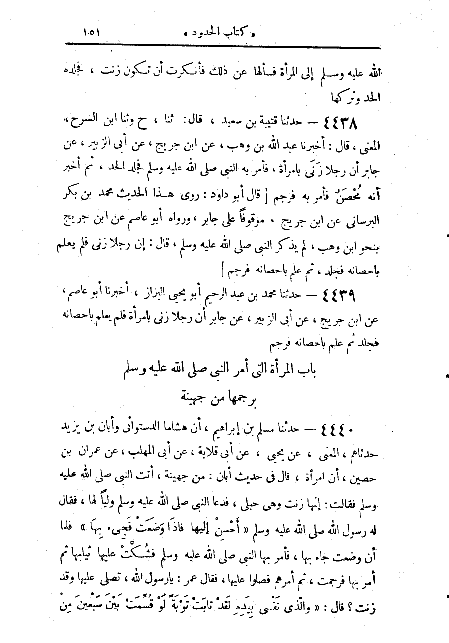 4440 - حَدَّثَنَا مُسْلِمُ بْنُ إِبْرَاهِيمَ، أَنَّ هِشَامًا الدَّسْتُوَائِيَّ، وَأَبَانَ ابْنَ يَزِيدَ، حَدَّثَاهُمْ، الْمَعْنَى، عَنْ يَحْيَى، عَنْ أَبِي قِلَابَةَ، عَنْ أَبِي الْمُهَلَّبِ، عَنْ عِمْرَانَ بْنِ حُصَيْنٍ، أَنَّ امْرَأَةً، - قَالَ فِي حَدِيثِ أَبَانَ: مِنْ جُهَيْنَةَ -، أَتَتِ النَّبِيَّ صَلَّى اللهُ عَلَيْهِ وَسَلَّمَ، فَقَالَتْ إِنَّهَا زَنَتْ، وَهِيَ حُبْلَى، فَدَعَا النَّبِيُّ صَلَّى اللهُ عَلَيْهِ وَسَلَّمَ وَلِيًّا لَهَا، فَقَالَ لَهُ رَسُولُ اللَّهِ صَلَّى اللهُ عَلَيْهِ وَسَلَّمَ: «أَحْسِنْ إِلَيْهَا، فَإِذَا وَضَعَتْ فَجِئْ بِهَا»، فَلَمَّا أَنْ وَضَعَتْ جَاءَ بِهَا، فَأَمَرَ بِهَا النَّبِيُّ صَلَّى اللهُ عَلَيْهِ وَسَلَّمَ، فَشُكَّتْ عَلَيْهَا ثِيَابُهَا، ثُمَّ أَمَرَ بِهَا فَرُجِمَتْ، ثُمَّ أَمَرَهُمْ فَصَلُّوا عَلَيْهَا، فَقَالَ عُمَرُ، يَا رَسُولَ اللَّهِ، تُصَلِّي عَلَيْهَا وَقَدْ زَنَتْ؟ قَالَ: «وَالَّذِي نَفْسِي بِيَدِهِ، لَقَدْ §تَابَتْ تَوْبَةً لَوْ قُسِّمَتْ بَيْنَ سَبْعِينَ مِنْ -[152]- أَهْلِ الْمَدِينَةِ لَوَسِعَتْهُمْ، وَهَلْ وَجَدْتَ أَفْضَلَ مِنْ أَنْ جَادَتْ بِنَفْسِهَا» لَمْ يَقُلْ عَنْ أَبَانَ: فَشُكَّتْ عَلَيْهَا ثِيَابُهَا