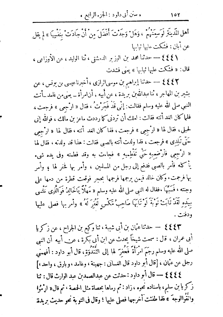 4443 - حَدَّثَنَا عُثْمَانُ بْنُ أَبِي شَيْبَةَ، حَدَّثَنَا وَكِيعُ بْنُ الْجَرَّاحِ، عَنْ زَكَرِيَّا أَبِي عِمْرَانَ، قَالَ: سَمِعْتُ شَيْخًا، يُحَدِّثُ عَنِ ابْنِ أَبِي بَكْرَةَ، عَنْ أَبِيهِ، «§أَنَّ النَّبِيَّ صَلَّى اللهُ عَلَيْهِ وَسَلَّمَ رَجَمَ امْرَأَةً، فَحُفِرَ لَهَا إِلَى الثَّنْدُوَةِ» قَالَ أَبُو دَاوُدَ: «أَفْهَمَنِي رَجُلٌ عَنْ عُثْمَانَ». قَالَ أَبُو دَاوُدَ: قَالَ الْغَسَّانِيُّ: «جُهَيْنَةُ وَغَامِدٌ وَبَارِقٌ وَاحِدٌ»