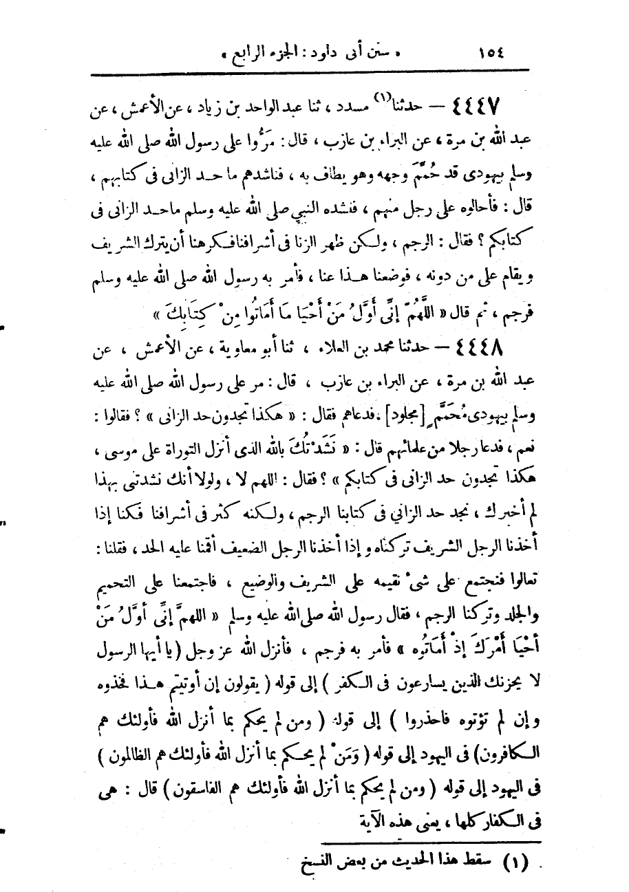 4447 - حَدَّثَنَا مُسَدَّدٌ، حَدَّثَنَا عَبْدُ الْوَاحِدِ بْنُ زِيَادٍ، عَنِ الْأَعْمَشِ، عَنْ عَبْدِ اللَّهِ بْنِ مُرَّةَ، عَنِ الْبَرَاءِ بْنِ عَازِبٍ، قَالَ: مَرُّوا عَلَى رَسُولِ اللَّهِ صَلَّى اللهُ عَلَيْهِ وَسَلَّمَ بِيَهُودِيٍّ قَدْ حُمِّمَ وَجْهُهُ، وَهُوَ يُطَافُ بِهِ، فَنَاشَدَهُمْ: «مَا حَدُّ الزَّانِي فِي كِتَابِهِمْ؟» قَالَ: فَأَحَالُوهُ عَلَى رَجُلٍ مِنْهُمْ، فَنَشَدَهُ النَّبِيُّ صَلَّى اللهُ عَلَيْهِ وَسَلَّمَ: «مَا حَدُّ الزَّانِي فِي كِتَابِكُمْ؟» فَقَالَ: الرَّجْمُ، وَلَكِنْ ظَهَرَ الزِّنَا فِي أَشْرَافِنَا، فَكَرِهْنَا أَنْ يُتْرَكَ الشَّرِيفُ، وَيُقَامُ عَلَى مَنْ دُونَهُ، فَوَضَعْنَا هَذَا عَنَّا، فَأَمَرَ بِهِ رَسُولُ اللَّهِ صَلَّى اللهُ عَلَيْهِ وَسَلَّمَ فَرُجِمَ، ثُمَّ قَالَ: «§اللَّهُمَّ إِنِّي أَوَّلُ مَنْ أَحْيَا مَا أَمَاتُوا مِنْ كِتَابِكَ»
