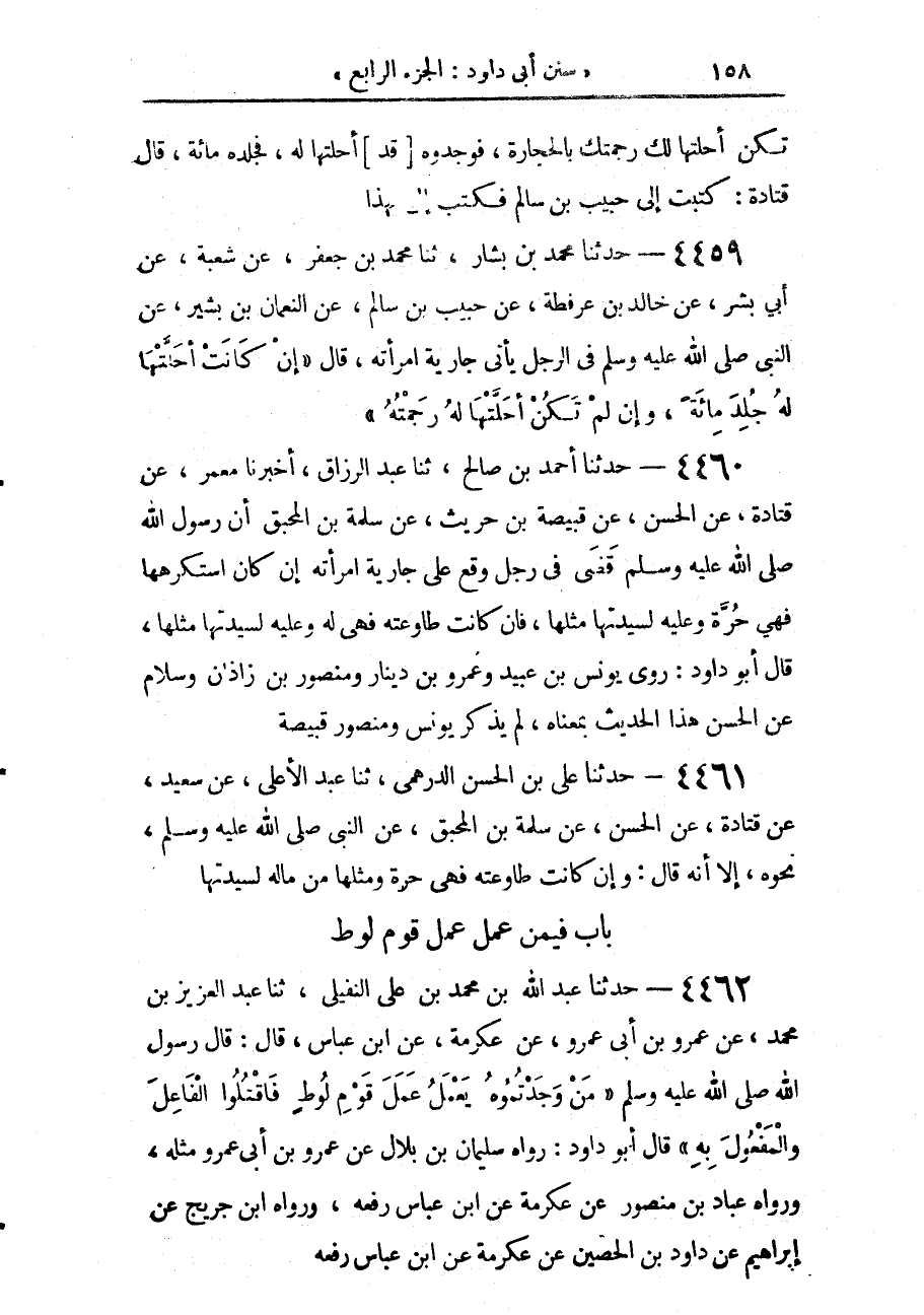 4462 - حَدَّثَنَا عَبْدُ اللَّهِ بْنُ مُحَمَّدِ بْنِ عَلِيٍّ النُّفَيْلِيُّ، حَدَّثَنَا عَبْدُ الْعَزِيزِ بْنُ مُحَمَّدٍ، عَنْ عَمْرِو بْنِ أَبِي عَمْرٍو، عَنْ عِكْرِمَةَ، عَنِ ابْنِ عَبَّاسٍ، قَالَ: قَالَ رَسُولُ اللَّهِ صَلَّى اللهُ عَلَيْهِ وَسَلَّمَ: «§مَنْ وَجَدْتُمُوهُ يَعْمَلُ عَمَلَ قَوْمِ لُوطٍ، فَاقْتُلُوا الْفَاعِلَ، وَالْمَفْعُولَ بِهِ» قَالَ أَبُو دَاوُدَ: رَوَاهُ سُلَيْمَانُ بْنُ بِلَالٍ، عَنْ عَمْرِو بْنِ أَبِي عَمْرٍو مِثْلَهُ وَرَوَاهُ عَبَّادُ بْنُ مَنْصُورٍ، عَنْ عِكْرِمَةَ، عَنِ ابْنِ عَبَّاسٍ رَفَعَهُ، وَرَوَاهُ ابْنُ جُرَيْجٍ، عَنْ إِبْرَاهِيمَ، عَنْ دَاوُدَ بْنِ الْحُصَيْنِ، عَنْ عِكْرِمَةَ، عَنِ ابْنِ عَبَّاسٍ رَفَعَهُ