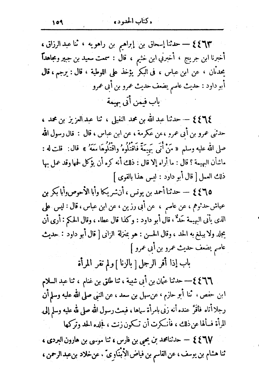 4465 - حَدَّثَنَا أَحْمَدُ بْنُ يُونُسَ، أَنَّ شَرِيكًا، وَأَبَا الْأَحْوَصِ، وَأَبَا بَكْرِ بْنَ عَيَّاشٍ حَدَّثُوهُمْ، عَنْ عَاصِمٍ، عَنْ أَبِي رَزِينٍ، عَنِ ابْنِ عَبَّاسٍ، قَالَ: «§لَيْسَ عَلَى الَّذِي يَأْتِي الْبَهِيمَةَ حَدٌّ» قَالَ أَبُو دَاوُدَ: وَكَذَا قَالَ عَطَاءٌ، وَقَالَ الْحَكَمُ: «أَرَى أَنْ يُجْلَدَ، وَلَا يُبْلَغَ بِهِ الْحَدَّ» وَقَالَ الْحَسَنُ: «هُوَ بِمَنْزِلَةِ الزَّانِي» قَالَ أَبُو دَاوُدَ: «حَدِيثُ عَاصِمٍ يُضَعِّفُ حَدِيثَ عَمْرِو بْنِ أَبِي عَمْرٍو»