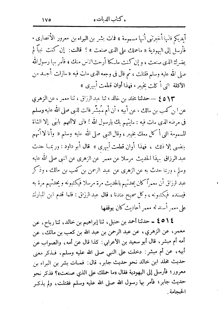 4513 - حَدَّثَنَا مَخْلَدُ بْنُ خَالِدٍ، حَدَّثَنَا عَبْدُ الرَّزَّاقِ، حَدَّثَنَا مَعْمَرٌ، عَنِ الزُّهْرِيِّ، عَنِ ابْنِ كَعْبِ بْنِ مَالِكٍ، عَنْ أَبِيهِ، أَنَّ أُمَّ مُبَشِّرٍ، قَالَتْ لِلنَّبِيِّ صَلَّى اللهُ عَلَيْهِ وَسَلَّمَ فِي مَرَضِهِ الَّذِي مَاتَ فِيهِ: مَا يُتَّهَمُ بِكَ يَا رَسُولَ اللَّهِ؟ فَإِنِّي لَا أَتَّهِمُ بِابْنِي شَيْئًا إِلَّا الشَّاةَ الْمَسْمُومَةَ الَّتِي أَكَلَ مَعَكَ بِخَيْبَرَ، وَقَالَ النَّبِيُّ صَلَّى اللهُ عَلَيْهِ وَسَلَّمَ «§وَأَنَا لَا أَتَّهِمُ بِنَفْسِي إِلَّا ذَلِكَ، فَهَذَا أَوَانُ قَطَعَتْ أَبْهَرِي» قَالَ أَبُو دَاوُدَ: " وَرُبَّمَا حَدَّثَ عَبْدُ الرَّزَّاقِ، بِهَذَا الْحَدِيثِ مُرْسَلًا عَنْ مَعْمَرٍ، عَنِ الزُّهْرِيِّ، عَنِ النَّبِيِّ صَلَّى اللهُ عَلَيْهِ وَسَلَّمَ: وَرُبَّمَا حَدَّثَ بِهِ عَنِ الزُّهْرِيِّ، عَنْ عَبْدِ الرَّحْمَنِ بْنِ كَعْبِ بْنِ مَالِكٍ، وَذَكَرَ عَبْدُ الرَّزَّاقِ أَنَّ مَعْمَرًا كَانَ يُحَدِّثُهُمْ بِالْحَدِيثِ مَرَّةً مُرْسَلًا فَيَكْتُبُونَهُ، وَيُحَدِّثُهُمْ مَرَّةً بِهِ فَيُسْنِدُهُ فَيَكْتُبُونَهُ، وَكُلٌّ صَحِيحٌ عِنْدَنَا، قَالَ عَبْدُ الرَّزَّاقِ: فَلَمَّا قَدِمَ ابْنُ الْمُبَارَكِ عَلَى مَعْمَرٍ أَسْنَدَ لَهُ مَعْمَرٌ أَحَادِيثَ كَانَ يُوقِفُهَا "،