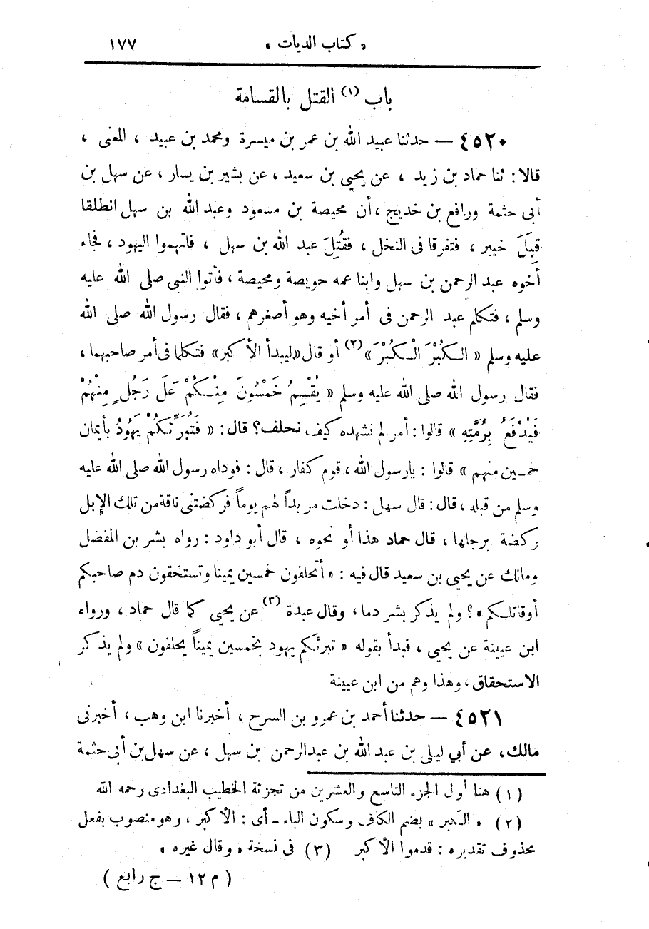 4520 - حَدَّثَنَا عُبَيْدُ اللَّهِ بْنُ عُمَرَ بْنِ مَيْسَرَةَ، وَمُحَمَّدُ بْنُ عُبَيْدٍ الْمَعْنَى قَالَا: حَدَّثَنَا حَمَّادُ بْنُ زَيْدٍ، عَنْ يَحْيَى بْنِ سَعِيدٍ، عَنْ بُشَيْرِ بْنِ يَسَارٍ، عَنْ سَهْلِ بْنِ أَبِي حَثْمَةَ، وَرَافِعِ بْنِ خَدِيجٍ، أَنَّ مُحَيِّصَةَ بْنَ مَسْعُودٍ، وَعَبْدَ اللَّهِ بْنَ سَهْلٍ، انْطَلَقَا قِبَلَ خَيْبَرَ فَتَفَرَّقَا فِي النَّخْلِ فَقُتِلَ عَبْدُ اللَّهِ بْنُ سَهْلٍ فَاتَّهَمُوا الْيَهُودَ فَجَاءَ أَخُوهُ عَبْدُ الرَّحْمَنِ بْنُ سَهْلٍ وَابْنَا عَمِّهِ حُوَيِّصَةُ وَمُحَيِّصَةُ فَأَتَوُا النَّبِيَّ صَلَّى اللهُ عَلَيْهِ وَسَلَّمَ فَتَكَلَّمَ عَبْدُ الرَّحْمَنِ فِي أَمْرِ أَخِيهِ وَهُوَ أَصْغَرُهُمْ فَقَالَ رَسُولُ اللَّهِ صَلَّى اللهُ عَلَيْهِ وَسَلَّمَ: «§الْكُبْرَ الْكُبْرَ» أَوْ قَالَ: «لِيَبْدَأِ الْأَكْبَرُ» فَتَكَلَّمَا فِي أَمْرِ صَاحِبِهِمَا، فَقَالَ رَسُولُ اللَّهِ صَلَّى اللهُ عَلَيْهِ وَسَلَّمَ: «يُقْسِمُ خَمْسُونَ مِنْكُمْ عَلَى رَجُلٍ مِنْهُمْ فَيُدْفَعُ بِرُمَّتِهِ» قَالُوا: أَمْرٌ لَمْ نَشْهَدْهُ كَيْفَ نَحْلِفُ؟ قَالَ: «فَتُبَرِّئُكُمْ يَهُودُ بِأَيْمَانِ خَمْسِينَ مِنْهُمْ» قَالُوا: يَا رَسُولَ اللَّهِ، قَوْمٌ كُفَّارٌ، قَالَ: فَوَدَاهُ رَسُولُ اللَّهِ صَلَّى اللهُ عَلَيْهِ وَسَلَّمَ مِنْ قِبَلِهِ، قَالَ سَهْلٌ: «دَخَلْتُ مِرْبَدًا لَهُمْ يَوْمًا فَرَكَضَتْنِي نَاقَةٌ مِنْ تِلْكَ الْإِبِلِ رَكْضَةً بِرِجْلِهَا»، قَالَ حَمَّادٌ: هَذَا أَوْ نَحْوَهُ قَالَ أَبُو دَاوُدَ: رَوَاهُ بِشْرُ بْنُ الْمُفَضَّلِ، وَمَالِكٌ، عَنْ يَحْيَى بْنِ سَعِيدٍ قَالَ: فِيهِ «أَتَحْلِفُونَ خَمْسِينَ يَمِينًا وَتَسْتَحِقُّونَ دَمَ صَاحِبِكُمْ أَوْ قَاتِلِكُمْ؟» وَلَمْ يَذْكُرْ بِشْرٌ دَمًا، وقَالَ عَبْدَةُ، عَنْ يَحْيَى، كَمَا قَالَ حَمَّادٌ: وَرَوَاهُ ابْنُ عُيَيْنَةَ، عَنْ يَحْيَى فَبَدَأَ بِقَوْلِهِ: «تُبَرِّئُكُمْ يَهُودُ بِخَمْسِينَ يَمِينًا، يَحْلِفُونَ» وَلَمْ يَذْكُرِ الِاسْتِحْقَاقَ، قَالَ أَبُو دَاوُدَ: «وَهَذَا وَهْمٌ مِنَ ابْنِ عُيَيْنَةَ»