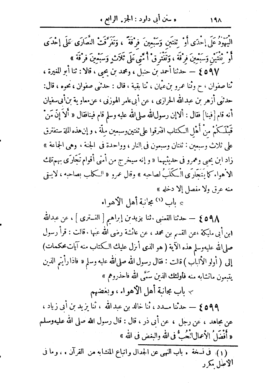 4597 - حَدَّثَنَا أَحْمَدُ بْنُ حَنْبَلٍ، وَمُحَمَّدُ بْنُ يَحْيَى، قَالَا: حَدَّثَنَا أَبُو الْمُغِيرَةِ، حَدَّثَنَا صَفْوَانُ، ح وحَدَّثَنَا عَمْرُو بْنُ عُثْمَانَ، حَدَّثَنَا بَقِيَّةُ، قَالَ: حَدَّثَنِي صَفْوَانُ، نَحْوَهُ قَالَ: حَدَّثَنِي أَزْهَرُ بْنُ عَبْدِ اللَّهِ الْحَرَازِيُّ، عَنْ أَبِي عَامِرٍ الْهَوْزَنِيِّ، عَنْ مُعَاوِيَةَ بْنِ أَبِي سُفْيَانَ، أَنَّهُ قَامَ فِينَا فَقَالَ: أَلَا إِنَّ رَسُولَ اللَّهِ صَلَّى اللهُ عَلَيْهِ وَسَلَّمَ قَامَ فِينَا فَقَالَ: " §أَلَا إِنَّ مَنْ قَبْلَكُمْ مِنْ أَهْلِ الْكِتَابِ افْتَرَقُوا عَلَى ثِنْتَيْنِ وَسَبْعِينَ مِلَّةً، وَإِنَّ هَذِهِ الْمِلَّةَ سَتَفْتَرِقُ عَلَى ثَلَاثٍ وَسَبْعِينَ: ثِنْتَانِ وَسَبْعُونَ فِي النَّارِ، وَوَاحِدَةٌ فِي الْجَنَّةِ، وَهِيَ الْجَمَاعَةُ «زَادَ ابْنُ يَحْيَى، وَعَمْرٌو فِي حَدِيثَيْهِمَا» وَإِنَّهُ سَيَخْرُجُ مِنْ أُمَّتِي أَقْوَامٌ تَجَارَى بِهِمْ تِلْكَ الْأَهْوَاءُ، كَمَا يَتَجَارَى الْكَلْبُ لِصَاحِبِهِ " وَقَالَ عَمْرٌو: «الْكَلْبُ بِصَاحِبِهِ لَا يَبْقَى مِنْهُ عِرْقٌ وَلَا مَفْصِلٌ إِلَّا دَخَلَهُ»