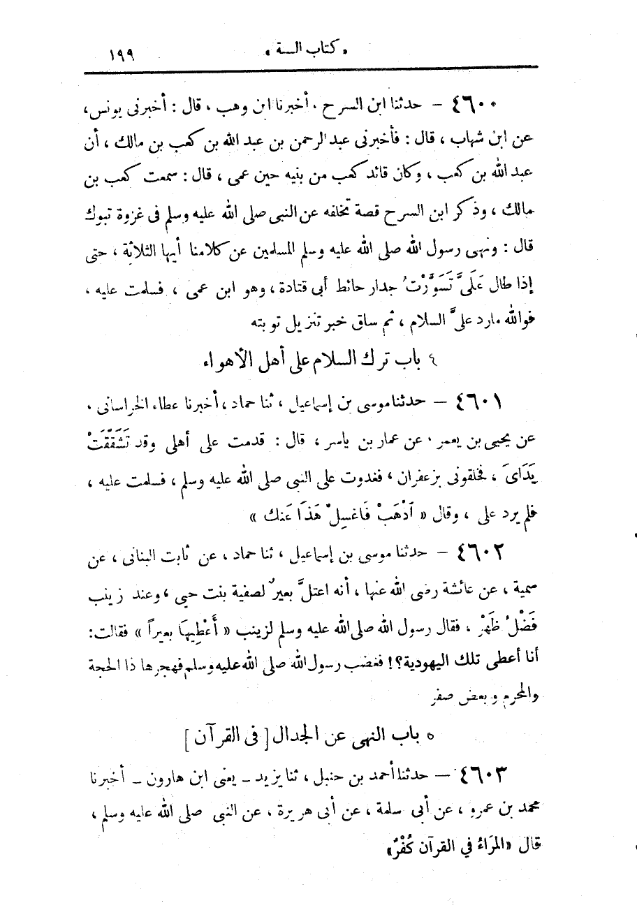 4600 - حَدَّثَنَا ابْنُ السَّرْحِ، أَخْبَرَنَا ابْنُ وَهْبٍ، قَالَ: أَخْبَرَنِي يُونُسُ، عَنِ ابْنِ شِهَابٍ، قَالَ: أَخْبَرَنِي عَبْدُ الرَّحْمَنِ بْنُ عَبْدِ اللَّهِ بْنِ كَعْبِ بْنِ مَالِكٍ، أَنَّ عَبْدَ اللَّهِ بْنَ كَعْبِ بْنِ مَالِكٍ، وَكَانَ، قَائِدَ كَعْبٍ مِنْ بَنِيهِ حِينَ عَمِيَ قَالَ: سَمِعْتُ كَعْبَ بْنَ مَالِكٍ، - وَذَكَرَ ابْنُ السَّرْحِ، قِصَّةَ تَخَلُّفِهِ عَنِ النَّبِيِّ صَلَّى اللهُ عَلَيْهِ وَسَلَّمَ فِي غَزْوَةِ تَبُوكَ - قَالَ: «§وَنَهَى رَسُولُ اللَّهِ صَلَّى اللهُ عَلَيْهِ وَسَلَّمَ الْمُسْلِمِينَ عَنْ كَلَامِنَا أَيُّهَا الثَّلَاثَةَ، حَتَّى إِذَا طَالَ عَلَيَّ تَسَوَّرْتُ جِدَارَ حَائِطِ أَبِي قَتَادَةَ، وَهُوَ ابْنُ عَمِّي، فَسَلَّمْتُ عَلَيْهِ، فَوَاللَّهِ مَا رَدَّ عَلَيَّ السَّلَامَ، ثُمَّ سَاقَ خَبَرَ تَنْزِيلِ تَوْبَتِهِ»