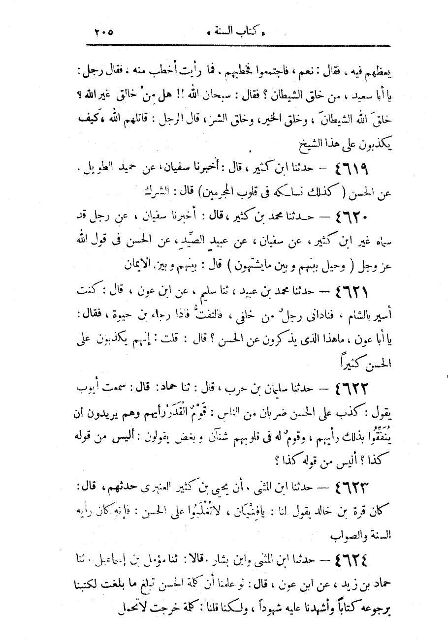 4622 - حَدَّثَنَا سُلَيْمَانُ بْنُ حَرْبٍ، قَالَ: حَدَّثَنَا حَمَّادٌ، قَالَ: سَمِعْتُ أَيُّوبَ، يَقُولُ: " §كَذَبَ عَلَى الْحَسَنِ ضَرْبَانِ مِنَ النَّاسِ: قَوْمٌ الْقَدَرُ رَأْيُهُمْ وَهُمْ يُرِيدُونَ أَنْ يُنَفِّقُوا بِذَلِكَ رَأْيَهُمْ، وَقَوْمٌ لَهُ فِي قُلُوبِهِمْ شَنَآنٌ وَبُغْضٌ يَقُولُونَ: أَلَيْسَ مِنْ قَوْلِهِ كَذَا؟ أَلَيْسَ مِنْ قَوْلِهِ كَذَا؟ "