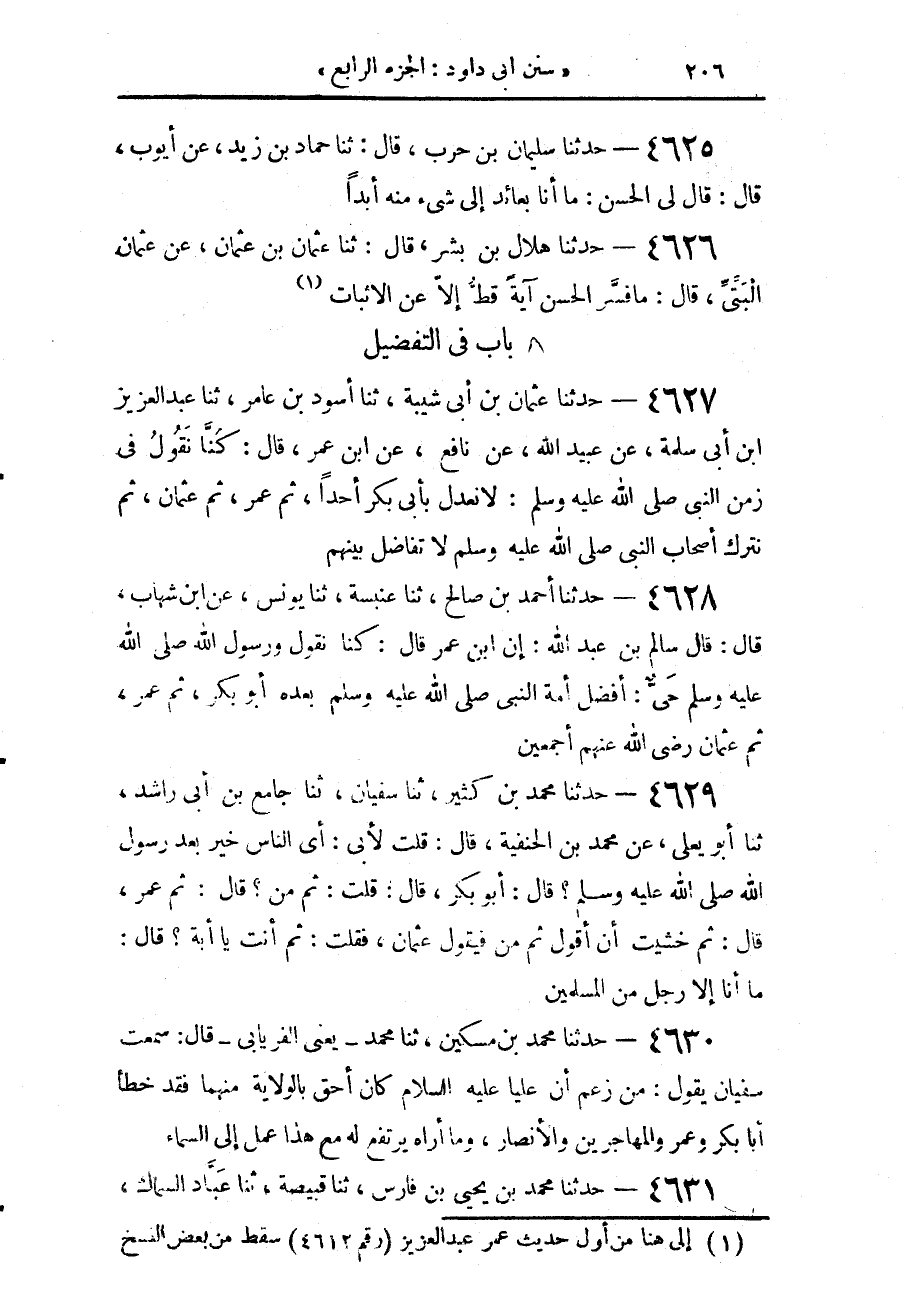 4628 - حَدَّثَنَا أَحْمَدُ بْنُ صَالِحٍ، حَدَّثَنَا عَنْبَسَةُ، حَدَّثَنَا يُونُسُ، عَنِ ابْنِ شِهَابٍ، قَالَ: قَالَ سَالِمُ بْنُ عَبْدِ اللَّهِ: إِنَّ ابْنَ عُمَرَ قَالَ: كُنَّا نَقُولُ وَرَسُولُ اللَّهِ صَلَّى اللهُ عَلَيْهِ وَسَلَّمَ حَيٌّ: «§أَفْضَلُ أُمَّةِ النَّبِيِّ صَلَّى اللهُ عَلَيْهِ وَسَلَّمَ بَعْدَهُ أَبُو بَكْرٍ، ثُمَّ عُمَرُ، ثُمَّ عُثْمَانُ، رَضِيَ اللَّهُ عَنْهُمْ أَجْمَعِينَ»