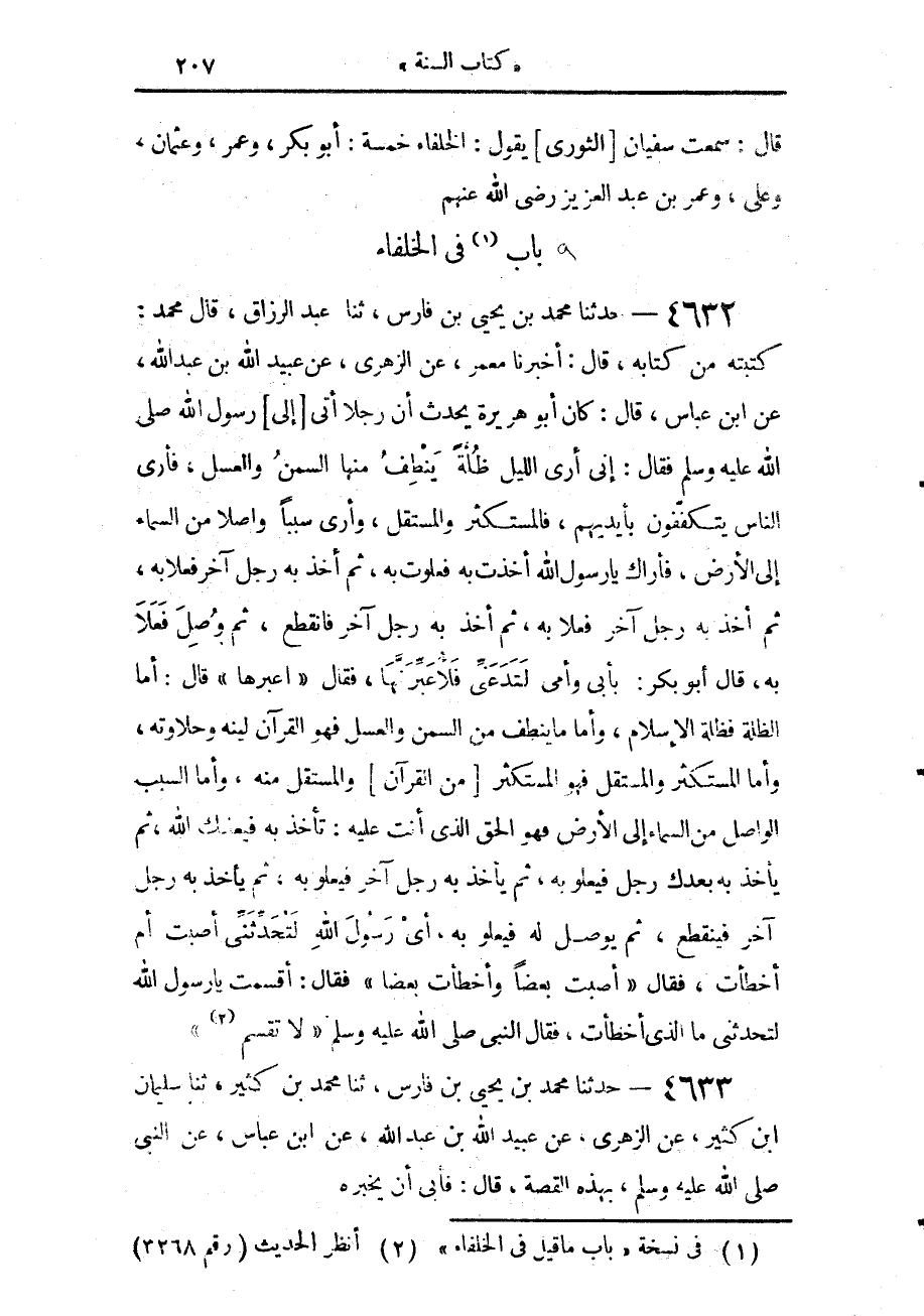 4632 - حَدَّثَنَا مُحَمَّدُ بْنُ يَحْيَى بْنِ فَارِسٍ، حَدَّثَنَا عَبْدُ الرَّزَّاقِ، قَالَ: مُحَمَّدٌ كَتَبْتُهُ مِنْ كِتَابِهِ، قَالَ: أَخْبَرَنَا مَعْمَرٌ، عَنِ الزُّهْرِيِّ، عَنْ عُبَيْدِ اللَّهِ بْنِ عَبْدِ اللَّهِ، عَنِ ابْنِ عَبَّاسٍ، قَالَ: كَانَ أَبُو هُرَيْرَةَ يُحَدِّثُ أَنَّ رَجُلًا أَتَى إِلَى رَسُولِ اللَّهِ صَلَّى اللهُ عَلَيْهِ وَسَلَّمَ فَقَالَ: إِنِّي أَرَى اللَّيْلَةَ §ظُلَّةً يَنْطِفُ مِنْهَا السَّمْنُ وَالْعَسَلُ، فَأَرَى النَّاسَ يَتَكَفَّفُونَ بِأَيْدِيهِمْ، فَالْمُسْتَكْثِرُ، وَالْمُسْتَقِلُّ، وَأَرَى سَبَبًا وَاصِلًا مِنَ السَّمَاءِ إِلَى الْأَرْضِ، فَأَرَاكَ يَا رَسُولَ اللَّهِ أَخَذْتَ بِهِ فَعَلَوْتَ بِهِ، ثُمَّ أَخَذَ بِهِ رَجُلٌ آخَرُ فَعَلَا بِهِ، ثُمَّ أَخَذَ بِهِ رَجُلٌ آخَرُ فَعَلَا بِهِ ثُمَّ أَخَذَ بِهِ رَجُلٌ آخَرُ فَانْقَطَعَ، ثُمَّ وُصِلَ فَعَلَا بِهِ، قَالَ أَبُو بَكْرٍ: بِأَبِي وَأُمِّي لَتَدَعَنِّي فَلَأُعَبِّرَنَّهَا، فَقَالَ: «اعْبُرْهَا» قَالَ: أَمَّا الظُّلَّةُ فَظُلَّةُ الْإِسْلَامِ، وَأَمَّا مَا يَنْطِفُ مِنَ السَّمْنِ، وَالْعَسَلِ، فَهُوَ الْقُرْآنُ لِينُهُ وَحَلَاوَتُهُ، وَأَمَّا الْمُسْتَكْثِرُ، وَالْمُسْتَقِلُّ، فَهُوَ الْمُسْتَكْثِرُ مِنَ الْقُرْآنِ، وَالْمُسْتَقِلُّ مِنْهُ، وَأَمَّا السَّبَبُ الْوَاصِلُ مِنَ السَّمَاءِ إِلَى الْأَرْضِ فَهُوَ الْحَقُّ الَّذِي أَنْتَ عَلَيْهِ: تَأْخُذُ بِهِ فَيُعْلِيكَ اللَّهُ، ثُمَّ يَأْخُذُ بِهِ بَعْدَكَ رَجُلٌ فَيَعْلُو بِهِ، ثُمَّ يَأْخُذُ بِهِ رَجُلٌ آخَرُ فَيَعْلُو بِهِ، ثُمَّ يَأْخُذُ بِهِ رَجُلٌ آخَرُ فَيَنْقَطِعُ، ثُمَّ يُوصَلُ لَهُ فَيَعْلُو بِهِ، أَيْ رَسُولَ اللَّهِ لَتُحَدِّثَنِّي أَصَبْتُ أَمْ أَخْطَأْتُ، فَقَالَ: «أَصَبْتَ بَعْضًا وَأَخْطَأْتَ بَعْضًا» فَقَالَ: أَقْسَمْتُ يَا رَسُولَ اللَّهِ لَتُحَدِّثَنِّي مَا الَّذِي أَخْطَأْتُ، فَقَالَ النَّبِيُّ صَلَّى اللهُ عَلَيْهِ وَسَلَّمَ: «لَا تُقْسِمْ»