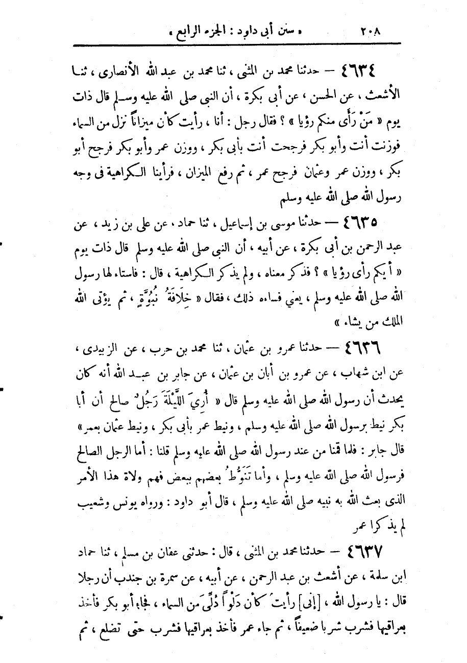 4634 - حَدَّثَنَا مُحَمَّدُ بْنُ الْمُثَنَّى، حَدَّثَنَا مُحَمَّدُ بْنُ عَبْدِ اللَّهِ الْأَنْصَارِيُّ، حَدَّثَنَا الْأَشْعَثُ، عَنِ الْحَسَنِ، عَنْ أَبِي بَكْرَةَ، أَنَّ النَّبِيَّ صَلَّى اللهُ عَلَيْهِ وَسَلَّمَ قَالَ ذَاتَ يَوْمٍ: «مَنْ رَأَى مِنْكُمْ رُؤْيَا؟» فَقَالَ رَجُلٌ: أَنَا، رَأَيْتُ كَأَنَّ §مِيزَانًا نَزَلَ مِنَ السَّمَاءِ فَوُزِنْتَ أَنْتَ وَأَبُو بَكْرٍ فَرَجَحْتَ أَنْتَ بِأَبِي بَكْرٍ، وَوُزِنَ عُمَرُ وَأَبُو بَكْرٍ، فَرَجَحَ أَبُو بَكْرٍ، وَوُزِنَ عُمَرُ وَعُثْمَانُ، فَرَجَحَ عُمَرُ ثُمَّ رُفِعَ الْمِيزَانُ، فَرَأَيْنَا الْكَرَاهِيَةَ فِي وَجْهِ رَسُولِ اللَّهِ صَلَّى اللهُ عَلَيْهِ وَسَلَّمَ