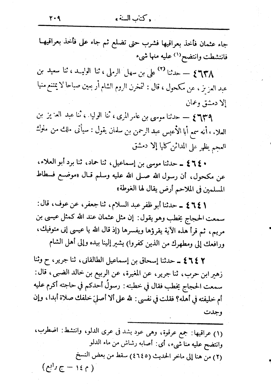 4638 - حَدَّثَنَا عَلِيُّ بْنُ سَهْلٍ الرَّمْلِيُّ، حَدَّثَنَا الْوَلِيدُ، حَدَّثَنَا سَعِيدُ بْنُ عَبْدِ الْعَزِيزِ، عَنْ مَكْحُولٍ، قَالَ: «§لَتَمْخُرَنَّ الرُّومُ الشَّامَ أَرْبَعِينَ صَبَاحًا لَا يَمْتَنِعُ مِنْهَا إِلَّا دِمَشْقَ وَعَمَّانَ»