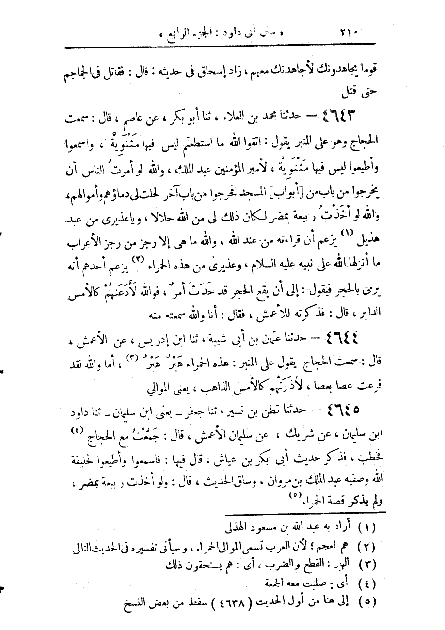 4643 - حَدَّثَنَا مُحَمَّدُ بْنُ الْعَلَاءِ، حَدَّثَنَا أَبُو بَكْرٍ، عَنْ عَاصِمٍ، قَالَ: سَمِعْتُ الْحَجَّاجَ، وَهُوَ عَلَى الْمِنْبَرِ يَقُولُ: " §اتَّقُوا اللَّهَ مَا اسْتَطَعْتُمْ لَيْسَ فِيهَا مَثْنَوِيَّةٌ، وَاسْمَعُوا وَأَطِيعُوا لَيْسَ فِيهَا مَثْنَوِيَّةٌ، لِأَمِيرِ الْمُؤْمِنِينَ عَبْدِ الْمَلِكِ، وَاللَّهِ لَوْ أَمَرْتُ النَّاسَ أَنْ يَخْرُجُوا مِنْ بَابٍ مِنْ أَبْوَابِ الْمَسْجِدِ فَخَرَجُوا مِنْ بَابٍ آخَرَ لَحَلَّتْ لِي دِمَاؤُهُمْ وَأَمْوَالُهُمْ، وَاللَّهِ لَوْ أَخَذْتُ رَبِيعَةَ بِمُضَرَ لَكَانَ ذَلِكَ لِي مِنَ اللَّهِ حَلَالًا، وَيَا عَذِيرِي مِنْ عَبْدِ هُذَيْلٍ يَزْعُمُ أَنَّ قِرَاءَتَهُ مِنْ عِنْدِ اللَّهِ، وَاللَّهِ مَا هِيَ إِلَّا رَجَزٌ مِنْ رَجَزِ الْأَعْرَابِ مَا أَنْزَلَهَا اللَّهُ عَلَى نَبِيِّهِ عَلَيْهِ السَّلَام، وَعَذِيرِي مِنْ هَذِهِ الْحَمْرَاءِ يَزْعُمُ أَحَدُهُمْ أَنَّهُ يَرْمِي بِالْحَجَرِ فَيَقُولُ: إِلَى أَنْ يَقَعَ الْحَجَرُ قَدْ حَدَثَ أَمْرٌ، فَوَاللَّهِ لَأَدَعَنَّهُمْ كَالْأَمْسِ الدَّابِرِ " قَالَ: فَذَكَرْتُهُ لِلْأَعْمَشِ فَقَالَ: أَنَا وَاللَّهِ سَمِعْتُهُ مِنْهُ