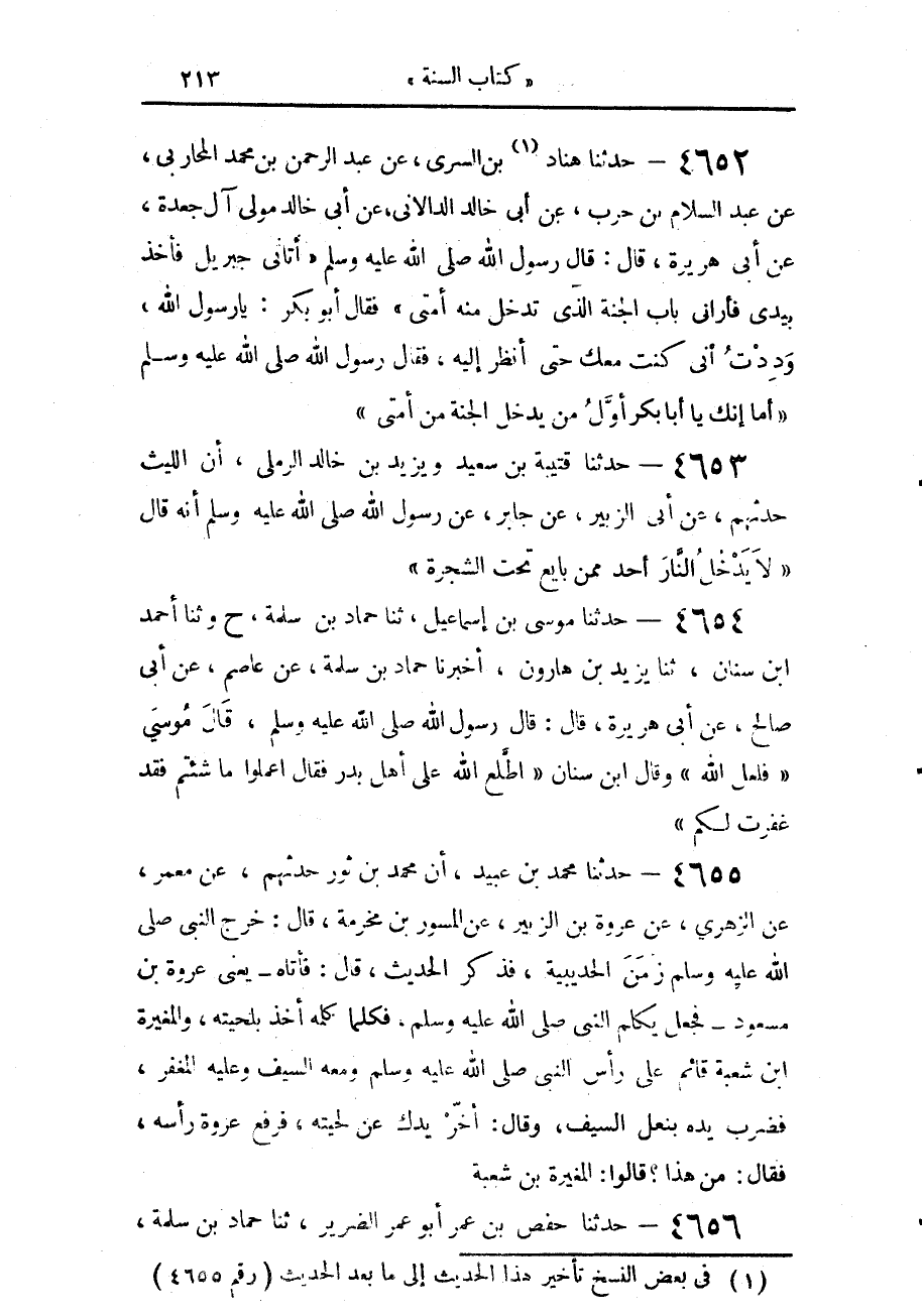 4652 - حَدَّثَنَا هَنَّادُ بْنُ السَّرِيِّ، عَنْ عَبْدِ الرَّحْمَنِ بْنِ مُحَمَّدٍ الْمُحَارِبِيِّ، عَنْ عَبْدِ السَّلَامِ بْنِ حَرْبٍ، عَنْ أَبِي خَالِدٍ الدَّالَانِيِّ، عَنْ أَبِي خَالِدٍ، مَوْلَى آلِ جَعْدَةَ عَنْ أَبِي هُرَيْرَةَ، قَالَ: قَالَ رَسُولُ اللَّهِ صَلَّى اللهُ عَلَيْهِ وَسَلَّمَ: «أَتَانِي جِبْرِيلُ فَأَخَذَ بِيَدِي فَأَرَانِي بَابَ الْجَنَّةِ الَّذِي تَدْخُلُ مِنْهُ أُمَّتِي» فَقَالَ أَبُو بَكْرٍ: يَا رَسُولَ اللَّهِ، وَدِدْتُ أَنِّي كُنْتُ مَعَكَ حَتَّى أَنْظُرَ إِلَيْهِ، فَقَالَ رَسُولُ اللَّهِ صَلَّى اللهُ عَلَيْهِ وَسَلَّمَ «§أَمَا إِنَّكَ يَا أَبَا بَكْرٍ أَوَّلُ مَنْ يَدْخُلُ الْجَنَّةَ مِنْ أُمَّتِي»