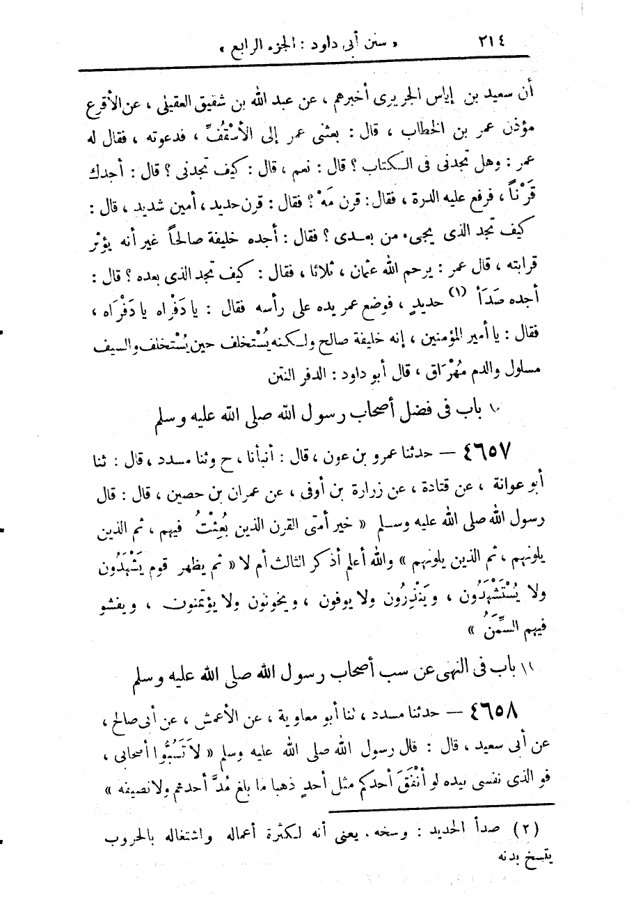 4658 - حَدَّثَنَا مُسَدَّدٌ، حَدَّثَنَا أَبُو مُعَاوِيَةَ، عَنِ الْأَعْمَشِ، عَنْ أَبِي صَالِحٍ، عَنْ أَبِي سَعِيدٍ، قَالَ: قَالَ رَسُولُ اللَّهِ صَلَّى اللهُ عَلَيْهِ وَسَلَّمَ: «§لَا تَسُبُّوا أَصْحَابِي، فَوَالَّذِي نَفْسِي بِيَدِهِ لَوْ أَنْفَقَ أَحَدُكُمْ مِثْلَ أُحُدٍ ذَهَبًا مَا بَلَغَ مُدَّ أَحَدِهِمْ وَلَا نَصِيفَهُ»