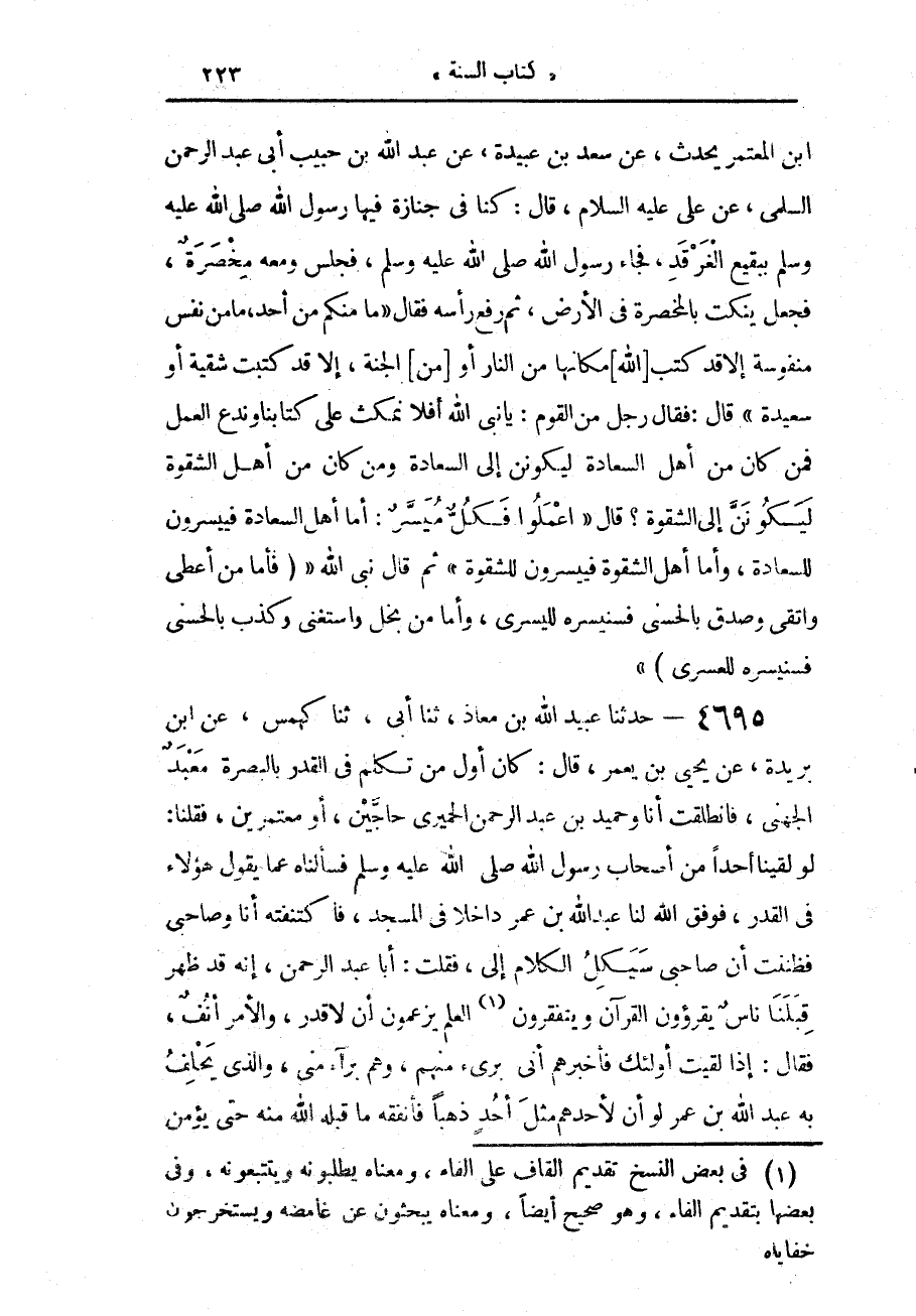 4695 - حَدَّثَنَا عُبَيْدُ اللَّهِ بْنُ مُعَاذٍ، حَدَّثَنَا أَبِي، حَدَّثَنَا كَهْمَسٌ، عَنِ ابْنِ بُرَيْدَةَ، عَنْ يَحْيَى بْنِ يَعْمَرَ، قَالَ: كَانَ أَوَّلَ مَنْ تَكَلَّمَ فِي الْقَدَرِ بِالْبَصْرَةِ مَعْبَدٌ الْجُهَنِيُّ فَانْطَلَقْتُ أَنَا وَحُمَيْدُ بْنُ عَبْدِ الرَّحْمَنِ الْحِمْيَرِيُّ حَاجَّيْنِ، أَوْ مُعْتَمِرَيْنِ، فَقُلْنَا: لَوْ لَقِينَا أَحَدًا مِنْ أَصْحَابِ رَسُولِ اللَّهِ صَلَّى اللهُ عَلَيْهِ وَسَلَّمَ فَسَأَلْنَاهُ عَمَّا يَقُولُ هَؤُلَاءِ فِي الْقَدَرِ، فَوَفَّقَ اللَّهُ لَنَا عَبْدَ اللَّهِ بْنَ عُمَرَ دَاخِلًا فِي الْمَسْجِدِ، فَاكْتَنَفْتُهُ أَنَا وَصَاحِبِي فَظَنَنْتُ أَنَّ صَاحِبِي سَيَكِلُ الْكَلَامَ إِلَيَّ، فَقُلْتُ: أَبَا عَبْدِ الرَّحْمَنِ، إِنَّهُ قَدْ ظَهَرَ قِبَلَنَا نَاسٌ يَقْرَءُونَ الْقُرْآنَ وَيَتَفَقَّرُونَ الْعِلْمَ يَزْعُمُونَ أَنْ لَا قَدَرَ، وَالْأَمْرَ أُنُفٌ، فَقَالَ: إِذَا لَقِيتَ أُولَئِكَ فَأَخْبِرْهُمْ أَنِّي بَرِيءٌ مِنْهُمْ، وَهُمْ بُرَآءُ مِنِّي، وَالَّذِي يَحْلِفُ بِهِ عَبْدُ اللَّهِ بْنُ عُمَرَ لَوْ أَنَّ لِأَحَدِهِمْ مِثْلَ أُحُدٍ ذَهَبًا فَأَنْفَقَهُ مَا قَبِلَهُ اللَّهُ مِنْهُ حَتَّى يُؤْمِنَ -[224]- بِالْقَدَرِ، ثُمَّ قَالَ: حَدَّثَنِي عُمَرُ بْنُ الْخَطَّابِ، قَالَ: بَيْنَمَا نَحْنُ عِنْدَ رَسُولِ اللَّهِ صَلَّى اللهُ عَلَيْهِ وَسَلَّمَ إِذْ طَلَعَ عَلَيْنَا رَجُلٌ شَدِيدُ بَيَاضِ الثِّيَابِ، شَدِيدُ سَوَادِ الشَّعْرِ، لَا يُرَى عَلَيْهِ أَثَرُ السَّفَرِ وَلَا نَعْرِفُهُ، حَتَّى جَلَسَ إِلَى النَّبِيِّ صَلَّى اللهُ عَلَيْهِ وَسَلَّمَ فَأَسْنَدَ رُكْبَتَيْهِ إِلَى رُكْبَتَيْهِ وَوَضَعَ كَفَّيْهِ عَلَى فَخِذَيْهِ، وَقَالَ: يَا مُحَمَّدُ، أَخْبِرْنِي عَنِ الْإِسْلَامِ، فَقَالَ رَسُولُ اللَّهِ صَلَّى اللهُ عَلَيْهِ وَسَلَّمَ: «§الْإِسْلَامُ أَنْ تَشْهَدَ أَنْ لَا إِلَهَ إِلَّا اللَّهُ وَأَنَّ مُحَمَّدًا رَسُولُ اللَّهِ، وَتُقِيمَ الصَّلَاةَ، وَتُؤْتِيَ الزَّكَاةَ، وَتَصُومَ رَمَضَانَ، وَتَحُجَّ الْبَيْتَ إِنِ اسْتَطَعْتَ إِلَيْهِ سَبِيلًا» قَالَ: صَدَقْتَ، قَالَ: فَعَجِبْنَا لَهُ يَسْأَلُهُ وَيُصَدِّقُهُ، قَالَ: فَأَخْبِرْنِي عَنِ الْإِيمَانِ، قَالَ: «أَنْ تُؤْمِنَ بِاللَّهِ، وَمَلَائِكَتِهِ، وَكُتُبِهِ، وَرُسُلِهِ، وَالْيَوْمِ الْآخِرِ، وَتُؤْمِنَ بِالْقَدَرِ خَيْرِهِ وَشَرِّهِ» قَالَ: صَدَقْتَ، قَالَ: فَأَخْبِرْنِي عَنِ الْإِحْسَانِ، قَالَ: «أَنْ تَعْبُدَ اللَّهَ كَأَنَّكَ تَرَاهُ، فَإِنْ لَمْ تَكُنْ تَرَاهُ فَإِنَّهُ يَرَاكَ» قَالَ: فَأَخْبِرْنِي عَنِ السَّاعَةِ، قَالَ: «مَا الْمَسْئُولُ عَنْهَا، بِأَعْلَمَ مِنَ السَّائِلِ» قَالَ: فَأَخْبِرْنِي عَنْ أَمَارَاتِهَا، قَالَ: «أَنْ تَلِدَ الْأَمَةُ رَبَّتَهَا، وَأَنْ تَرَى الْحُفَاةَ الْعُرَاةَ الْعَالَةَ، رِعَاءَ الشَّاءِ يَتَطَاوَلُونَ فِي الْبُنْيَانِ»، قَالَ: ثُمَّ انْطَلَقَ، فَلَبِثْتُ ثَلَاثًا، ثُمَّ قَالَ: «يَا عُمَرُ، هَلْ تَدْرِي مَنِ السَّائِلُ؟» قُلْتُ: اللَّهُ وَرَسُولُهُ أَعْلَمُ، قَالَ: «فَإِنَّهُ جِبْرِيلُ أَتَاكُمْ يُعَلِّمُكُمْ دِينَكُمْ»