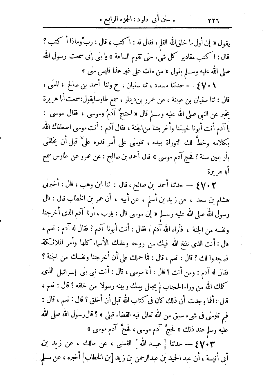 4701 - حَدَّثَنَا مُسَدَّدٌ، حَدَّثَنَا سُفْيَانُ، ح وحَدَّثَنَا أَحْمَدُ بْنُ صَالِحٍ الْمَعْنَى، قَالَ: حَدَّثَنَا سُفْيَانُ بْنُ عُيَيْنَةَ، عَنْ عَمْرِو بْنِ دِينَارٍ، سَمِعَ طَاوُسًا، يَقُولُ: سَمِعْتُ أَبَا هُرَيْرَةَ، يُخْبِرُ عَنِ النَّبِيِّ صَلَّى اللهُ عَلَيْهِ وَسَلَّمَ قَالَ: " §احْتَجَّ آدَمُ وَمُوسَى، فَقَالَ مُوسَى: يَا آدَمُ أَنْتَ أَبُونَا خَيَّبْتَنَا وَأَخْرَجْتَنَا مِنَ الْجَنَّةِ، فَقَالَ آدَمُ: أَنْتَ مُوسَى اصْطَفَاكَ اللَّهُ بِكَلَامِهِ وَخَطَّ لَكَ التَّوْرَاةَ بِيَدِهِ، تَلُومُنِي عَلَى أَمْرٍ قَدَّرَهُ عَلَيَّ قَبْلَ أَنْ يَخْلُقَنِي بِأَرْبَعِينَ سَنَةً؟ فَحَجَّ آدَمُ، مُوسَى " قَالَ: أَحْمَدُ بْنُ صَالِحٍ، عَنْ عَمْرٍو، عَنْ طَاوُسٍ، سَمِعَ أَبَا هُرَيْرَةَ
