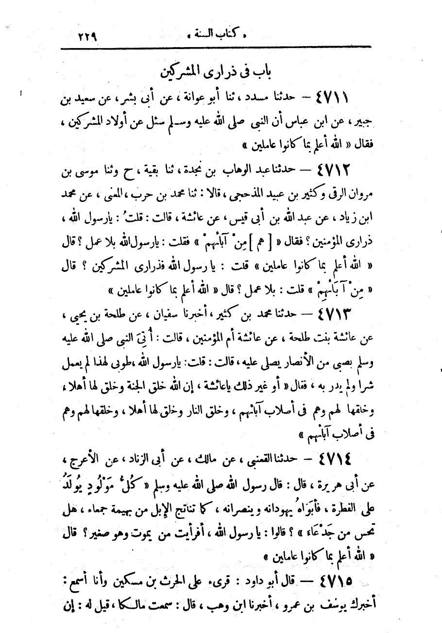4711 - حَدَّثَنَا مُسَدَّدٌ، حَدَّثَنَا أَبُو عَوَانَةَ، عَنْ أَبِي بِشْرٍ، عَنْ سَعِيدِ بْنِ جُبَيْرٍ، عَنِ ابْنِ عَبَّاسٍ، أَنَّ النَّبِيَّ صَلَّى اللهُ عَلَيْهِ وَسَلَّمَ سُئِلَ عَنْ أَوْلَادِ الْمُشْرِكِينَ، فَقَالَ: «§اللَّهُ أَعْلَمُ بِمَا كَانُوا عَامِلِينَ»