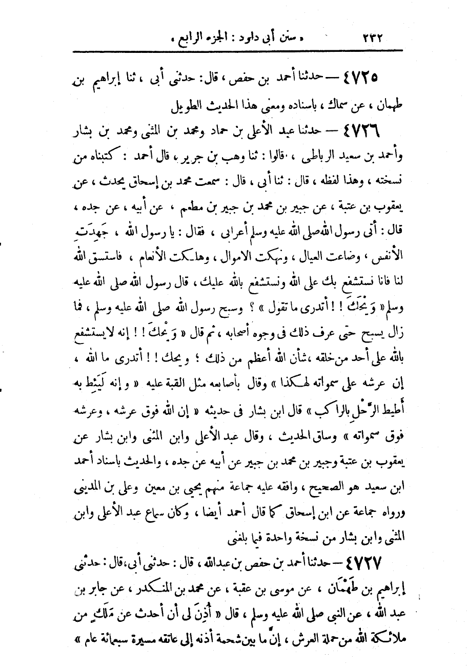 4726 - حَدَّثَنَا عَبْدُ الْأَعْلَى بْنُ حَمَّادٍ، وَمُحَمَّدُ بْنُ الْمُثَنَّى، وَمُحَمَّدُ بْنُ بَشَّارٍ، وَأَحْمَدُ بْنُ سَعِيدٍ الرِّبَاطِيُّ، قَالُوا: حَدَّثَنَا وَهْبُ بْنُ جَرِيرٍ، قَالَ أَحْمَدُ: كَتَبْنَاهُ مِنْ نُسْخَتِهِ وَهَذَا لَفْظُهُ قَالَ: حَدَّثَنَا أَبِي، قَالَ: سَمِعْتُ مُحَمَّدَ بْنَ إِسْحَاقَ، يُحَدِّثُ عَنْ يَعْقُوبَ بْنِ عُتْبَةَ، عَنْ جُبَيْرِ بْنِ مُحَمَّدِ بْنِ جُبَيْرِ بْنِ مُطْعِمٍ، عَنْ أَبِيهِ، عَنْ جَدِّهِ، قَالَ: أَتَى رَسُولَ اللَّهِ صَلَّى اللهُ عَلَيْهِ وَسَلَّمَ أَعْرَابِيٌّ، فَقَالَ: يَا رَسُولَ اللَّهِ، جُهِدَتِ الْأَنْفُسُ، وَضَاعَتِ الْعِيَالُ، وَنُهِكَتِ الْأَمْوَالُ، وَهَلَكَتْ الْأَنْعَامُ، فَاسْتَسْقِ اللَّهَ لَنَا فَإِنَّا نَسْتَشْفِعُ بِكَ عَلَى اللَّهِ وَنَسْتَشْفِعُ بِاللَّهِ عَلَيْكَ، قَالَ رَسُولُ اللَّهِ صَلَّى اللهُ عَلَيْهِ وَسَلَّمَ: «وَيْحَكَ أَتَدْرِي مَا تَقُولُ؟» وَسَبَّحَ رَسُولُ اللَّهِ صَلَّى اللهُ عَلَيْهِ وَسَلَّمَ، فَمَا زَالَ يُسَبِّحُ حَتَّى عُرِفَ ذَلِكَ فِي وُجُوهِ أَصْحَابِهِ، ثُمَّ قَالَ: «وَيْحَكَ §إِنَّهُ لَا يُسْتَشْفَعُ بِاللَّهِ عَلَى أَحَدٍ مِنْ خَلْقِهِ، شَأْنُ اللَّهِ أَعْظَمُ مِنْ ذَلِكَ، وَيْحَكَ أَتَدْرِي مَا اللَّهُ، إِنَّ عَرْشَهُ عَلَى سَمَاوَاتِهِ لَهَكَذَا» وَقَالَ بِأَصَابِعِهِ مِثْلَ الْقُبَّةِ عَلَيْهِ «وَإِنَّهُ لَيَئِطُّ بِهِ أَطِيطَ الرَّحْلِ بِالرَّاكِبِ» قَالَ ابْنُ بَشَّارٍ فِي حَدِيثِهِ: «إِنَّ اللَّهَ فَوْقَ عَرْشِهِ، وَعَرْشُهُ فَوْقَ سَمَاوَاتِهِ» وَسَاقَ الْحَدِيثَ، وَقَالَ عَبْدُ الْأَعْلَى: وَابْنُ الْمُثَنَّى، وَابْنُ بَشَّارٍ، عَنْ يَعْقُوبَ بْنِ عُتْبَةَ، وَجُبَيْرِ بْنِ مُحَمَّدِ بْنِ جُبَيْرٍ، عَنْ أَبِيهِ، عَنْ جَدِّهِ وَالْحَدِيثُ بِإِسْنَادِ أَحْمَدَ بْنِ سَعِيدٍ هُوَ الصَّحِيحُ وَافَقَهُ عَلَيْهِ جَمَاعَةٌ مِنْهُمْ يَحْيَى بْنُ مَعِينٍ، وَعَلِيُّ بْنُ الْمَدِينِيِّ، وَرَوَاهُ جَمَاعَةٌ عَنِ ابْنِ إِسْحَاقَ، كَمَا قَالَ أَحْمَدُ، أَيْضًا وَكَانَ سَمَاعُ عَبْدِ الْأَعْلَى، وَابْنِ الْمُثَنَّى، وَابْنِ بَشَّارٍ مِنْ نُسْخَةٍ وَاحِدَةٍ فِيمَا بَلَغَنِي