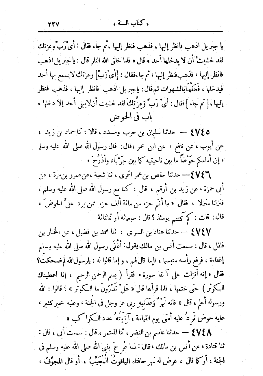 4747 - حَدَّثَنَا هَنَّادُ بْنُ السَّرِيِّ، حَدَّثَنَا مُحَمَّدُ بْنُ فُضَيْلٍ، عَنِ الْمُخْتَارِ بْنِ فُلْفُلٍ، قَالَ: سَمِعْتُ أَنَسَ بْنَ مَالِكٍ، يَقُولُ: أَغْفَى رَسُولُ اللَّهِ صَلَّى اللهُ عَلَيْهِ وَسَلَّمَ إِغْفَاءَةً، فَرَفَعَ رَأْسَهُ مُتَبَسِّمًا، فَإِمَّا قَالَ لَهُمْ، وَإِمَّا قَالُوا لَهُ: يَا رَسُولَ اللَّهِ لِمَ ضَحِكْتَ؟ فَقَالَ: «إِنَّهُ أُنْزِلَتْ عَلَيَّ آنِفًا سُورَةٌ» فَقَرَأَ بِسْمِ اللَّهِ الرَّحْمَنِ الرَّحِيمِ إِنَّا أَعْطَيْنَاكَ الْكَوْثَرَ حَتَّى خَتَمَهَا، فَلَمَّا قَرَأَهَا قَالَ: «§هَلْ تَدْرُونَ مَا الْكَوْثَرُ؟» قَالُوا: اللَّهُ وَرَسُولُهُ أَعْلَمُ، قَالَ: «فَإِنَّهُ نَهْرٌ وَعَدَنِيهِ رَبِّي عَزَّ وَجَلَّ فِي الْجَنَّةِ، وَعَلَيْهِ خَيْرٌ كَثِيرٌ، عَلَيْهِ حَوْضٌ تَرِدُ عَلَيْهِ أُمَّتِي يَوْمَ الْقِيَامَةِ، آنِيَتُهُ عَدَدُ الْكَوَاكِبِ»