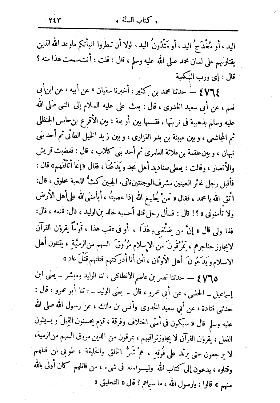 4764 - حَدَّثَنَا مُحَمَّدُ بْنُ كَثِيرٍ، أَخْبَرَنَا سُفْيَانُ، عَنْ أَبِيهِ، عَنِ ابْنِ أَبِي نُعْمٍ، عَنْ أَبِي سَعِيدٍ الْخُدْرِيِّ، قَالَ: بَعَثَ عَلِيٌّ عَلَيْهِ السَّلَام إِلَى النَّبِيِّ صَلَّى اللهُ عَلَيْهِ وَسَلَّمَ بِذُهَيْبَةٍ فِي تُرْبَتِهَا فَقَسَّمَهَا بَيْنَ أَرْبَعَةٍ بَيْنَ الْأَقْرَعِ بْنِ حَابِسٍ الْحَنْظَلِيِّ، ثُمَّ الْمُجَاشِعِيِّ، وَبَيْنَ عُيَيْنَةَ بْنِ بَدْرٍ الْفَزَارِيِّ وَبَيْنَ زَيْدِ الْخَيْلِ الطَّائِيِّ ثُمَّ أَحَدِ بَنِي نَبْهَانَ وَبَيْنَ عَلْقَمَةَ بْنِ عُلَاثَةَ الْعَامِرِيِّ ثُمَّ أَحَدِ بَنِي كِلَابٍ قَالَ: فَغَضِبَتْ قُرَيْشٌ وَالْأَنْصَارُ وَقَالَتْ: يُعْطِي صَنَادِيدَ أَهْلِ نَجْدٍ وَيَدَعُنَا، فَقَالَ: «إِنَّمَا أَتَأَلَّفُهُمْ» قَالَ: فَأَقْبَلَ رَجُلٌ غَائِرُ الْعَيْنَيْنِ، مُشْرِفُ الْوَجْنَتَيْنِ، نَاتِئُ الْجَبِينِ، كَثُّ اللِّحْيَةِ، مَحْلُوقٌ قَالَ: اتَّقِ اللَّهَ يَا مُحَمَّدُ، فَقَالَ: «مَنْ يُطِيعُ اللَّهَ إِذَا عَصَيْتُهُ، أَيَأْمَنُنِي اللَّهُ عَلَى أَهْلِ الْأَرْضِ وَلَا تَأْمَنُونِي؟ » قَالَ: فَسَأَلَ رَجُلٌ قَتْلَهُ أَحْسِبُهُ خَالِدَ بْنَ الْوَلِيدِ، قَالَ: فَمَنَعَهُ، قَالَ: فَلَمَّا وَلَّى قَالَ: «إِنَّ مِنْ ضِئْضِئِ هَذَا، أَوْ فِي عَقِبِ هَذَا، §قَوْمًا يَقْرَءُونَ الْقُرْآنَ لَا يُجَاوِزُ حَنَاجِرَهُمْ، يَمْرُقُونَ مِنَ الْإِسْلَامِ مُرُوقَ السَّهْمِ مِنَ الرَّمِيَّةِ، يَقْتُلُونَ أَهْلَ الْإِسْلَامِ وَيَدَعُونَ أَهْلَ الْأَوْثَانِ، لَئِنْ أَنَا أَدْرَكْتُهُمْ قَتَلْتُهُمْ قَتْلَ عَادٍ»
