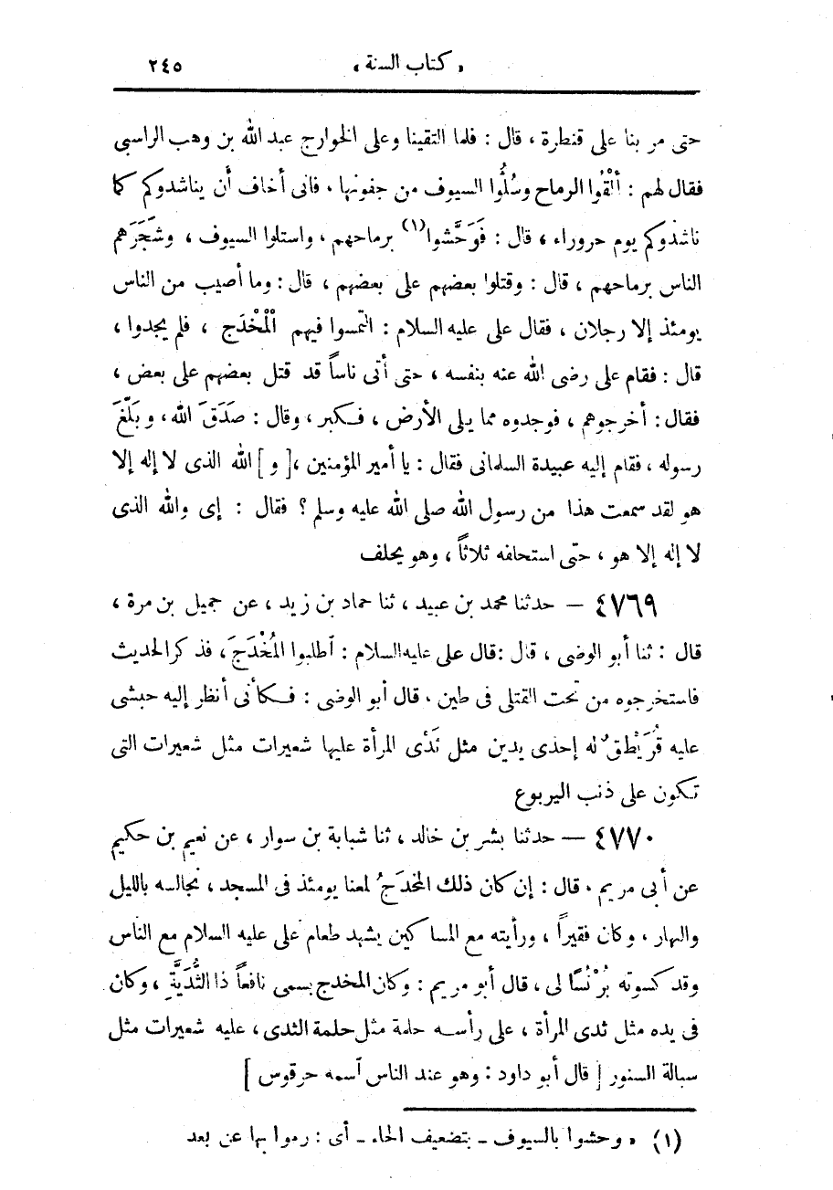 4769 - حَدَّثَنَا مُحَمَّدُ بْنُ عُبَيْدٍ، حَدَّثَنَا حَمَّادُ بْنُ زَيْدٍ، عَنْ جَمِيلِ بْنِ مُرَّةَ، قَالَ: حَدَّثَنَا أَبُو الْوَضِيءِ، قَالَ: قَالَ عَلِيٌّ، عَلَيْهِ السَّلَام اطْلُبُوا الْمُخْدَجَ فَذَكَرَ الْحَدِيثَ فَاسْتَخْرَجُوهُ مِنْ تَحْتِ الْقَتْلَى فِي طِينٍ قَالَ أَبُو الْوَضِيءِ: «فَكَأَنِّي أَنْظُرُ إِلَيْهِ حَبَشِيٌّ عَلَيْهِ قُرَيْطِقٌ لَهُ إِحْدَى يَدَيْنِ، مِثْلُ ثَدْيِ الْمَرْأَةِ عَلَيْهَا شُعَيْرَاتٌ مِثْلُ شُعَيْرَاتِ الَّتِي تَكُونُ عَلَى ذَنَبِ الْيَرْبُوعِ»