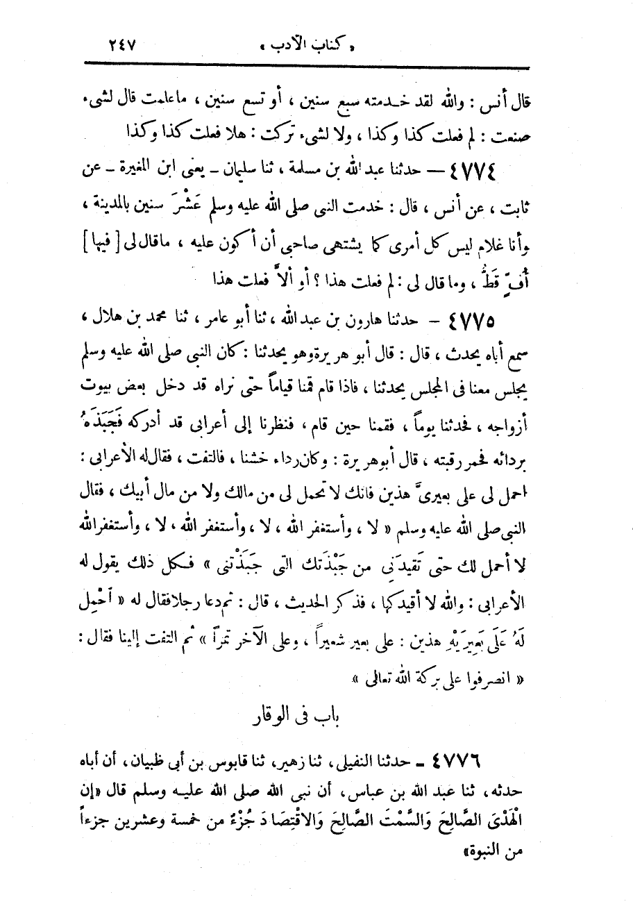 4775 - حَدَّثَنَا هَارُونُ بْنُ عَبْدِ اللَّهِ، حَدَّثَنَا أَبُو عَامِرٍ، حَدَّثَنَا مُحَمَّدُ بْنُ هِلَالٍ، أَنَّهُ سَمِعَ أَبَاهُ، يُحَدِّثُ قَالَ: قَالَ أَبُو هُرَيْرَةَ: وَهُوَ يُحَدِّثُنَا: كَانَ النَّبِيُّ صَلَّى اللهُ عَلَيْهِ وَسَلَّمَ §يَجْلِسُ مَعَنَا فِي الْمَجْلِسِ يُحَدِّثُنَا، فَإِذَا قَامَ قُمْنَا قِيَامًا حَتَّى نَرَاهُ قَدْ دَخَلَ بَعْضَ بُيُوتِ أَزْوَاجِهِ، فَحَدَّثَنَا يَوْمًا فَقُمْنَا حِينَ قَامَ، فَنَظَرْنَا إِلَى أَعْرَابِيٍّ قَدْ أَدْرَكَهُ فَجَبَذَهُ بِرِدَائِهِ فَحَمَّرَ رَقَبَتَهُ، قَالَ أَبُو هُرَيْرَةَ: وَكَانَ رِدَاءً خَشِنًا، فَالْتَفَتَ، فَقَالَ لَهُ الْأَعْرَابِيُّ: احْمِلْ لِي عَلَى بَعِيرَيَّ هَذَيْنِ فَإِنَّكَ لَا تَحْمِلُ لِي مِنْ مَالِكَ وَلَا مِنْ مَالِ أَبِيكَ، فَقَالَ النَّبِيُّ صَلَّى اللهُ عَلَيْهِ وَسَلَّمَ: «لَا، وَأَسْتَغْفِرُ اللَّهَ، لَا، وَأَسْتَغْفِرُ اللَّهَ، لَا، وَأَسْتَغْفِرُ اللَّهَ لَا أَحْمِلُ لَكَ حَتَّى تُقِيدَنِي مِنْ جَبْذَتِكَ الَّتِي جَبَذْتَنِي» فَكُلُّ ذَلِكَ يَقُولُ لَهُ الْأَعْرَابِيُّ: وَاللَّهِ لَا أُقِيدُكَهَا، فَذَكَرَ الْحَدِيثَ، قَالَ: ثُمَّ دَعَا رَجُلًا فَقَالَ لَهُ " احْمِلْ لَهُ عَلَى بَعِيرَيْهِ هَذَيْنِ: عَلَى بَعِيرٍ شَعِيرًا، وَعَلَى الْآخَرِ تَمْرًا " ثُمَّ الْتَفَتَ إِلَيْنَا فَقَالَ: «انْصَرِفُوا عَلَى بَرَكَةِ اللَّهِ تَعَالَى»