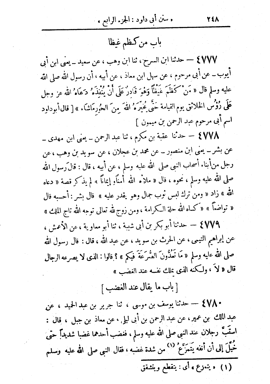 4777 - حَدَّثَنَا ابْنُ السَّرْحِ، حَدَّثَنَا ابْنُ وَهْبٍ، عَنْ سَعِيدٍ يَعْنِي ابْنَ أَبِي أَيُّوبَ، عَنْ أَبِي مَرْحُومٍ، عَنْ سَهْلِ بْنِ مُعَاذٍ، عَنْ أَبِيهِ، أَنَّ رَسُولَ اللَّهِ صَلَّى اللهُ عَلَيْهِ وَسَلَّمَ قَالَ: «§مَنْ كَظَمَ غَيْظًا وَهُوَ قَادِرٌ عَلَى أَنْ يُنْفِذَهُ، دَعَاهُ اللَّهُ عَزَّ وَجَلَّ عَلَى رُءُوسِ الْخَلَائِقِ يَوْمَ الْقِيَامَةِ حَتَّى يُخَيِّرَهُ اللَّهُ مِنَ الْحُورِ الْعِينِ مَا شَاءَ» قَالَ أَبُو دَاوُدَ: " اسْمُ أَبِي مَرْحُومٍ: عَبْدُ الرَّحْمَنِ بْنُ مَيْمُونٍ "