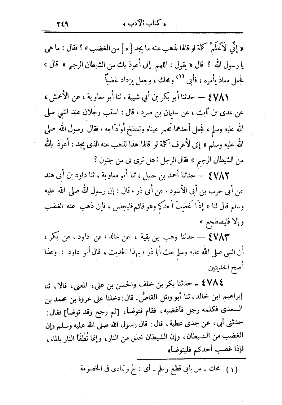 4781 - حَدَّثَنَا أَبُو بَكْرِ بْنُ أَبِي شَيْبَةَ، حَدَّثَنَا أَبُو مُعَاوِيَةَ، عَنِ الْأَعْمَشِ، عَنْ عَدِيِّ بْنِ ثَابِتٍ، عَنْ سُلَيْمَانَ بْنِ صُرَدٍ، قَالَ: اسْتَبَّ رَجُلَانِ عِنْدَ النَّبِيِّ صَلَّى اللهُ عَلَيْهِ وَسَلَّمَ، فَجَعَلَ أَحَدُهُمَا تَحْمَرُّ عَيْنَاهُ وَتَنْتَفِخُ أَوْدَاجُهُ، فَقَالَ رَسُولُ اللَّهِ صَلَّى اللهُ عَلَيْهِ وَسَلَّمَ: " إِنِّي لَأَعْرِفُ كَلِمَةً لَوْ قَالَهَا هَذَا لَذَهَبَ عَنْهُ الَّذِي يَجِدُ: §أَعُوذُ بِاللَّهِ مِنَ الشَّيْطَانِ الرَّجِيمِ " فَقَالَ الرَّجُلُ: هَلْ تَرَى بِي مِنْ جُنُونٍ؟