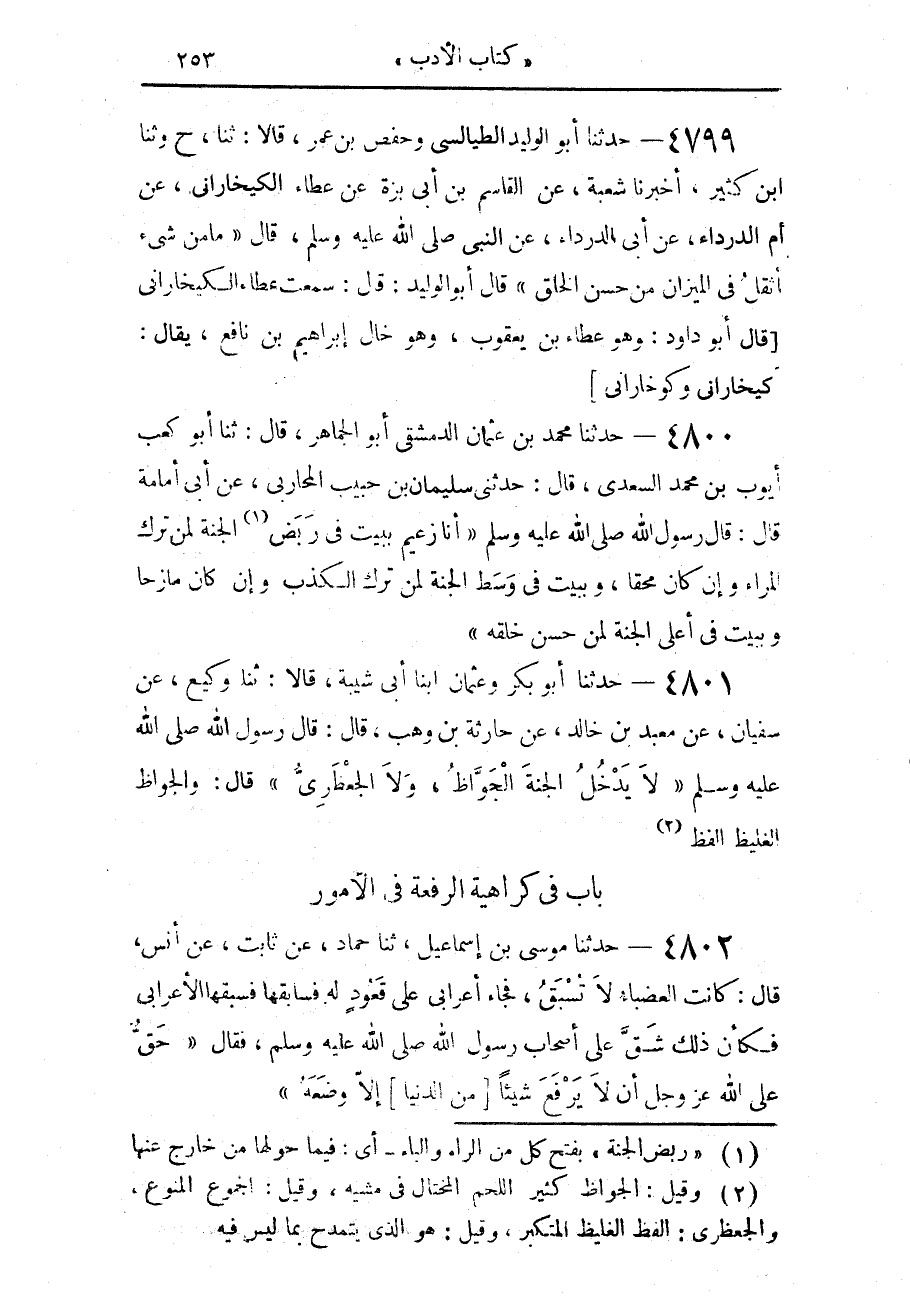 4800 - حَدَّثَنَا مُحَمَّدُ بْنُ عُثْمَانَ الدِّمَشْقِيُّ أَبُو الْجَمَاهِرِ، قَالَ: حَدَّثَنَا أَبُو كَعْبٍ أَيُّوبُ بْنُ مُحَمَّدٍ السَّعْدِيُّ، قَالَ: حَدَّثَنِي سُلَيْمَانُ بْنُ حَبِيبٍ الْمُحَارِبِيُّ، عَنْ أَبِي أُمَامَةَ، قَالَ: قَالَ رَسُولُ اللَّهِ صَلَّى اللهُ عَلَيْهِ وَسَلَّمَ: «§أَنَا زَعِيمٌ بِبَيْتٍ فِي رَبَضِ الْجَنَّةِ لِمَنْ تَرَكَ الْمِرَاءَ وَإِنْ كَانَ مُحِقًّا، وَبِبَيْتٍ فِي وَسَطِ الْجَنَّةِ لِمَنْ تَرَكَ الْكَذِبَ وَإِنْ كَانَ مَازِحًا وَبِبَيْتٍ فِي أَعْلَى الْجَنَّةِ لِمَنْ حَسَّنَ خُلُقَهُ»