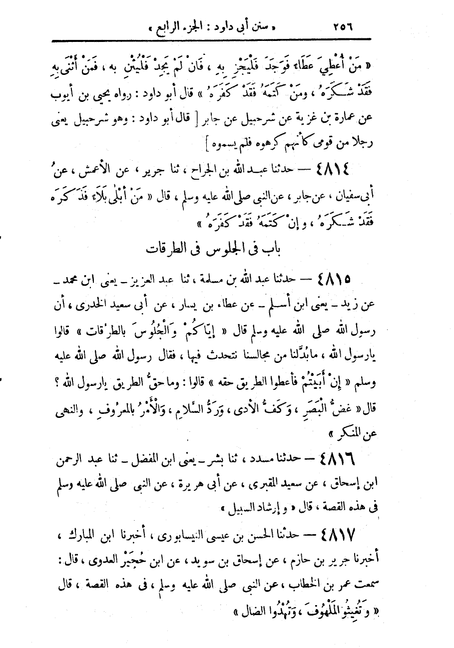 4815 - حَدَّثَنَا عَبْدُ اللَّهِ بْنُ مَسْلَمَةَ، حَدَّثَنَا عَبْدُ الْعَزِيزِ يَعْنِي ابْنَ مُحَمَّدٍ، عَنْ زَيْدٍ يَعْنِي ابْنَ أَسْلَمَ، عَنْ عَطَاءِ بْنِ يَسَارٍ، عَنْ أَبِي سَعِيدٍ الْخُدْرِيِّ، أَنَّ رَسُولَ اللَّهِ صَلَّى اللهُ عَلَيْهِ وَسَلَّمَ، قَالَ: «§إِيَّاكُمْ وَالْجُلُوسَ بِالطُّرُقَاتِ» قَالُوا: يَا رَسُولَ اللَّهِ، مَا بُدَّ لَنَا مِنْ مَجَالِسِنَا نَتَحَدَّثُ فِيهَا، فَقَالَ رَسُولُ اللَّهِ صَلَّى اللهُ عَلَيْهِ وَسَلَّمَ: «إِنْ أَبَيْتُمْ فَأَعْطُوا الطَّرِيقَ حَقَّهُ» قَالُوا: وَمَا حَقُّ الطَّرِيقِ يَا رَسُولَ اللَّهِ؟ قَالَ: «غَضُّ الْبَصَرِ، وَكَفُّ الْأَذَى، وَرَدُّ السَّلَامِ، وَالْأَمْرُ بِالْمَعْرُوفِ، وَالنَّهْيُ عَنِ المُنْكَرِ»