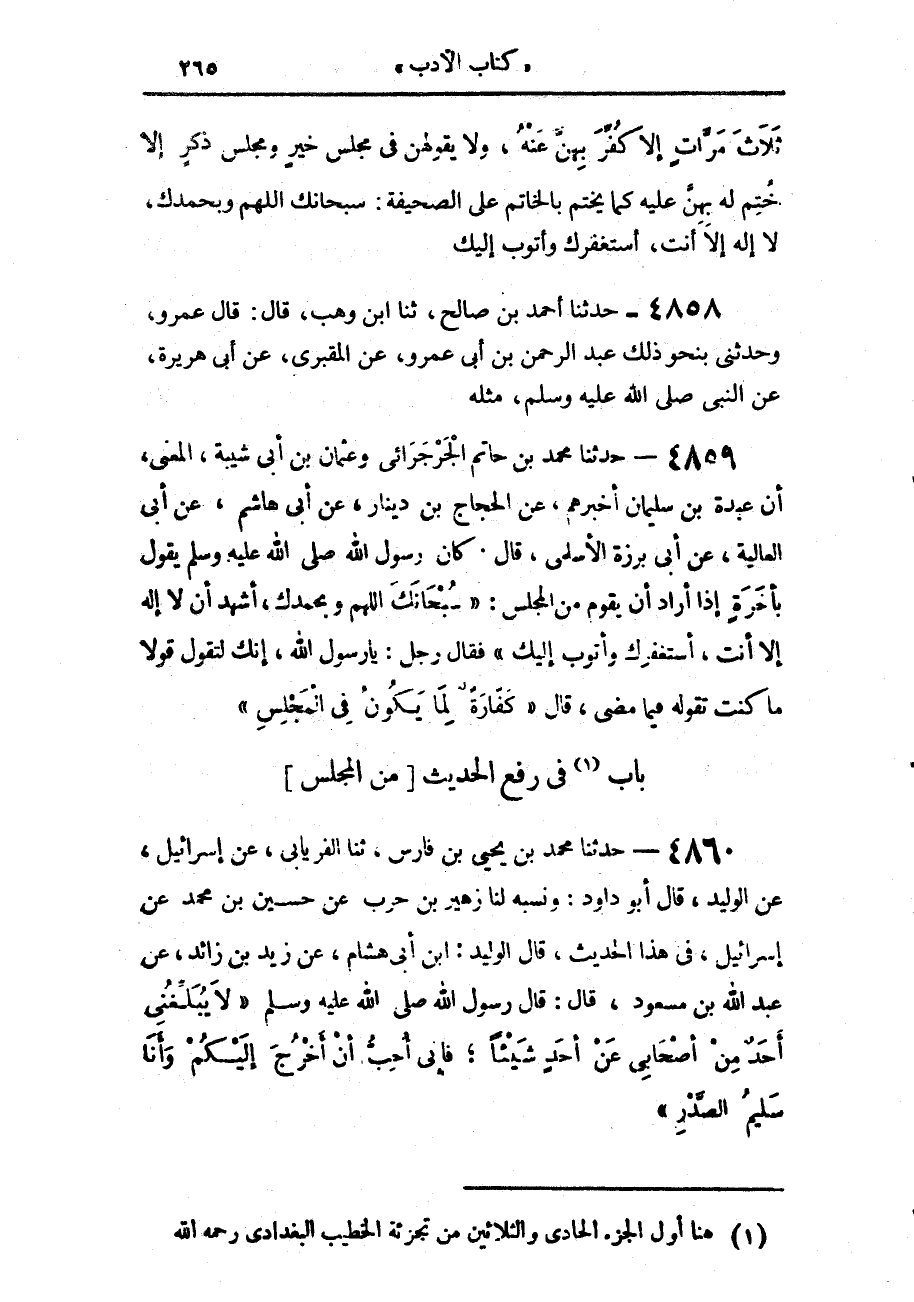 4859 - حَدَّثَنَا مُحَمَّدُ بْنُ حَاتِمٍ الْجَرْجَرَائِيُّ، وَعُثْمَانُ بْنُ أَبِي شَيْبَةَ الْمَعْنَى، أَنَّ عَبْدَةَ بْنَ سُلَيْمَانَ، أَخْبَرَهُمْ عَنِ الْحَجَّاجِ بْنِ ديِنَارٍ، عَنْ أَبِي هَاشِمٍ، عَنْ أَبِي الْعَالِيَةَ، عَنْ أَبِي بَرْزَةَ الْأَسْلَمِيِّ، قَالَ: كَانَ رَسُولُ اللَّهِ صَلَّى اللهُ عَلَيْهِ وَسَلَّمَ، يَقُولُ: بِأَخَرَةٍ §إِذَا أَرَادَ أَنْ يَقُومَ مِنَ الْمَجْلِسِ: «سُبْحَانَكَ اللَّهُمَّ وَبِحَمْدِكَ، أَشْهَدُ أَنْ لَا إِلَهَ إِلَّا أَنْتَ، أَسْتَغْفِرُكَ وَأَتُوبُ إِلَيْكَ» فَقَالَ رَجُلٌ: يَا رَسُولَ اللَّهِ، إِنَّكَ لَتَقُولُ قَوْلًا مَا كُنْتَ تَقُولُهُ فِيمَا مَضَى، فَقَالَ: «كَفَّارَةٌ لِمَا يَكُونُ فِي الْمَجْلِسِ»