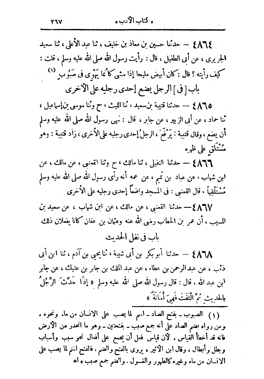 4865 - حَدَّثَنَا قُتَيْبَةُ بْنُ سَعِيدٍ، حَدَّثَنَا اللَّيْثُ، ح وحَدَّثَنَا مُوسَى بْنُ إِسْمَاعِيلَ، حَدَّثَنَا حَمَّادٌ، عَنْ أَبِي الزُّبَيْرِ، عَنْ جَابِرٍ، قَالَ: " §نَهَى رَسُولُ اللَّهِ صَلَّى اللهُ عَلَيْهِ وَسَلَّمَ أَنْ يَضَعَ - وَقَالَ قُتَيْبَةُ: يَرْفَعَ - الرَّجُلُ إِحْدَى رِجْلَيْهِ عَلَى الْأُخْرَى " زَادَ قُتَيْبَةُ: «وَهُوَ مُسْتَلْقٍ عَلَى ظَهْرِهِ»