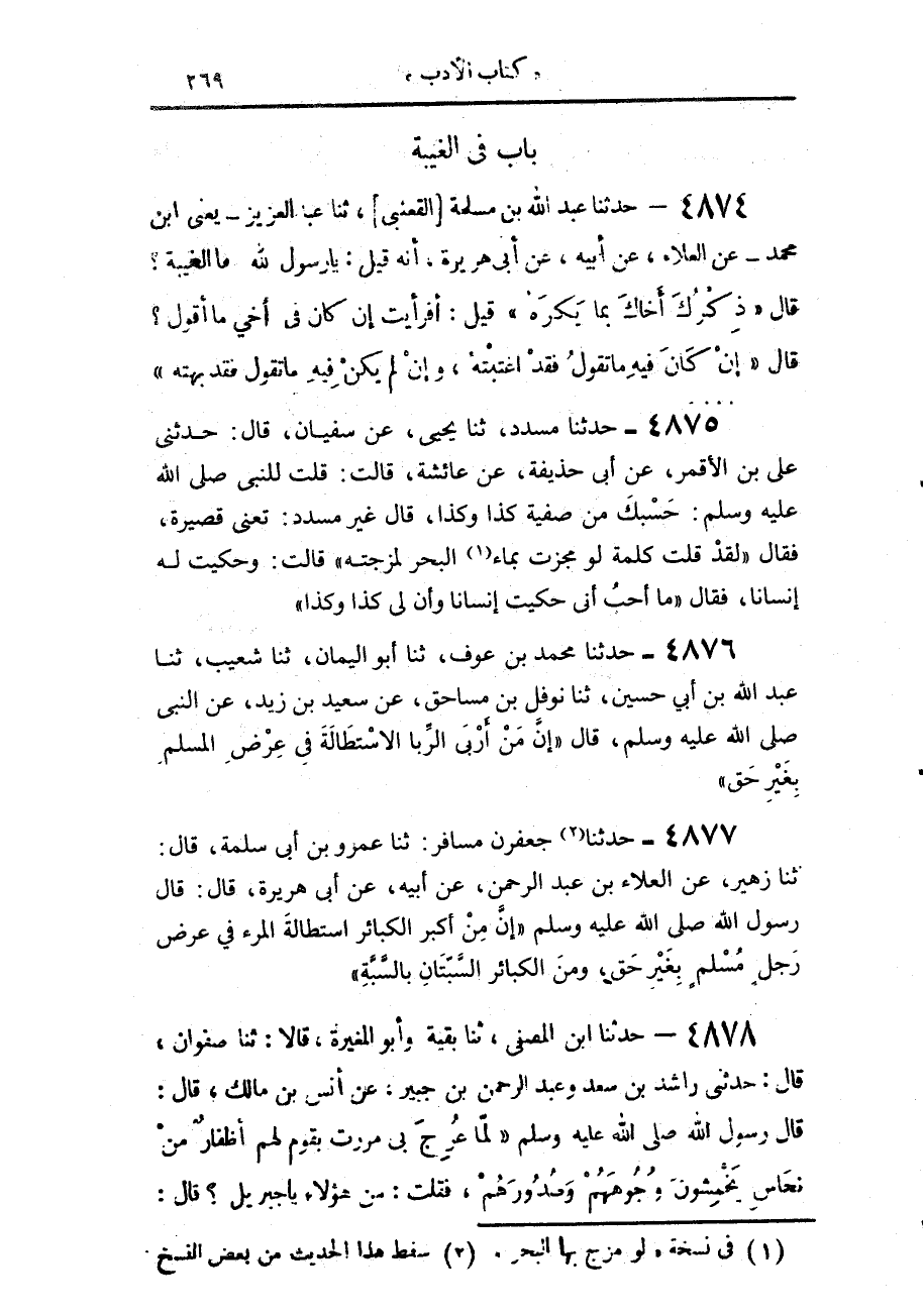 4874 - حَدَّثَنَا عَبْدُ اللَّهِ بْنُ مَسْلَمَةَ الْقَعْنَبِيُّ، حَدَّثَنَا عَبْدُ الْعَزِيزِ يَعْنِي ابْنَ مُحَمَّدٍ، عَنِ الْعَلَاءِ، عَنْ أَبِيهِ، عَنْ أَبِي هُرَيْرَةَ، أَنَّهُ قِيلَ يَا رَسُولَ اللَّهِ §مَا الْغِيبَةُ؟ قَالَ: «ذِكْرُكَ أَخَاكَ بِمَا يَكْرَهُ» قِيلَ: أَفَرَأَيْتَ إِنْ كَانَ فِي أَخِي مَا أَقُولُ؟ «قَالَ إِنْ كَانَ فِيهِ مَا تَقُولُ فَقَدْ اغْتَبْتَهُ، وَإِنْ لَمْ يَكُنْ فِيهِ مَا تَقُولُ فَقَدْ بَهَتَّهُ»